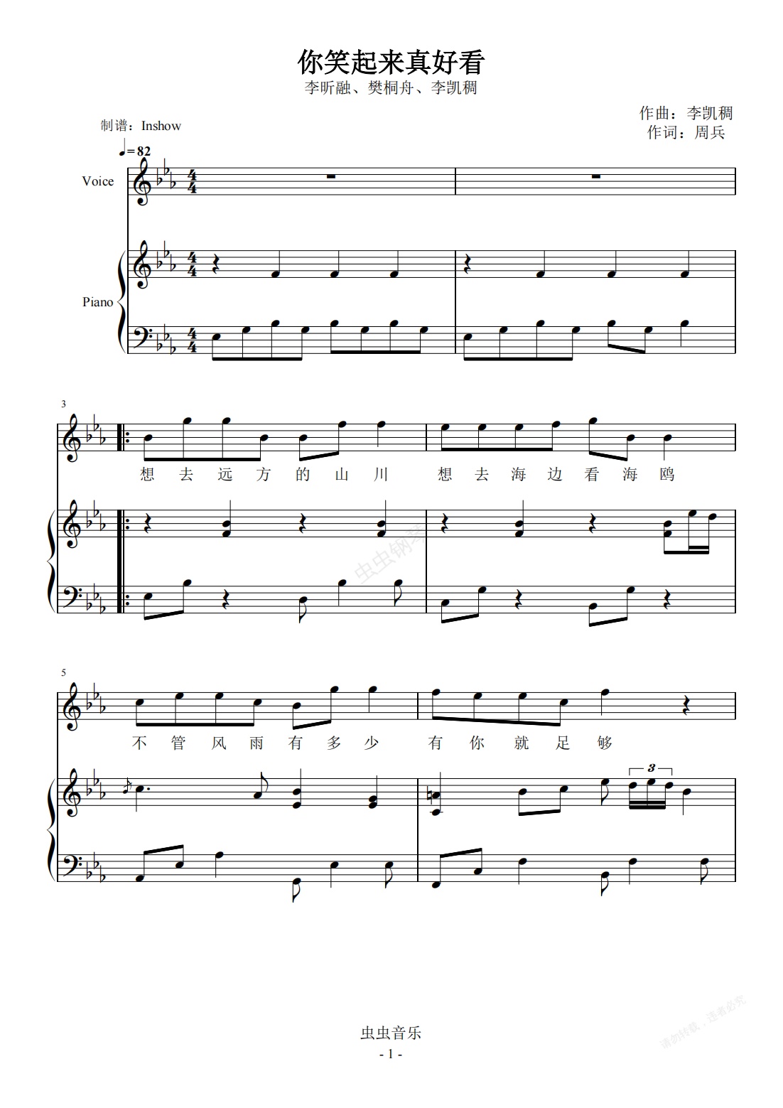 钢琴谱:你笑起来真好看【完整弹唱】- 李昕融、樊桐舟、李凯稠 -