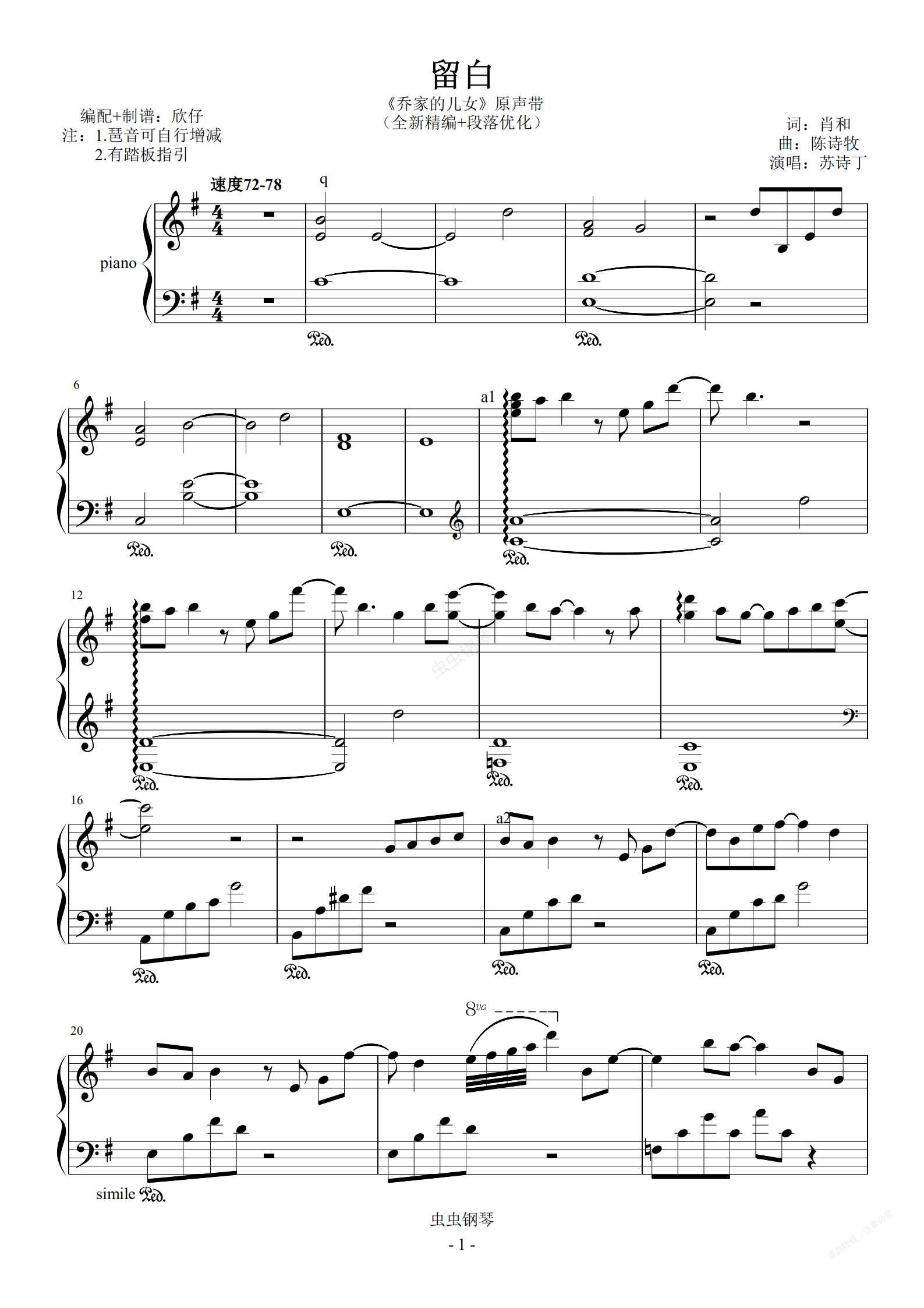 钢琴谱:苏诗丁-G《留白》(《乔家的儿女》原声带、全新精编+段落优化)