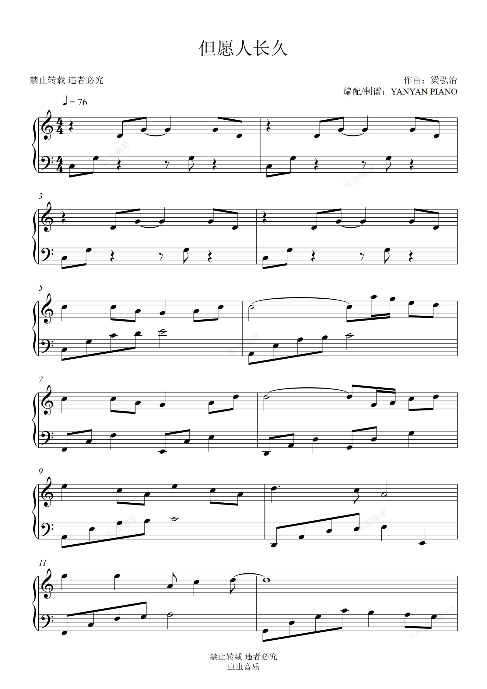 钢琴谱:好听易弹【但愿人长久】王菲 原唱:邓丽君