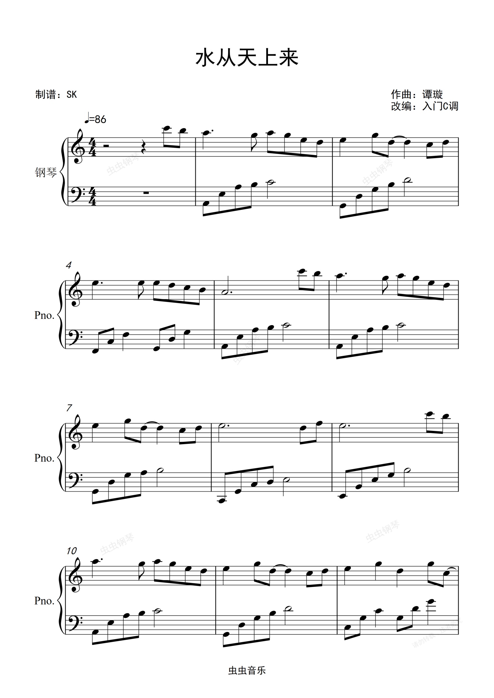 钢琴谱:郑云龙,张碧晨《水从天上来》电视剧《宸汐缘》插曲C调简单版