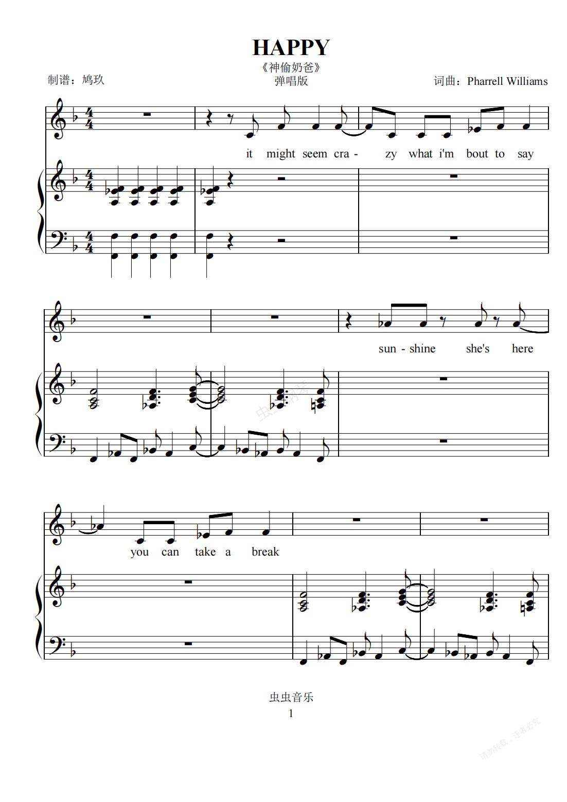 钢琴谱:Happy (神偷奶爸2电影主题曲)弹唱版