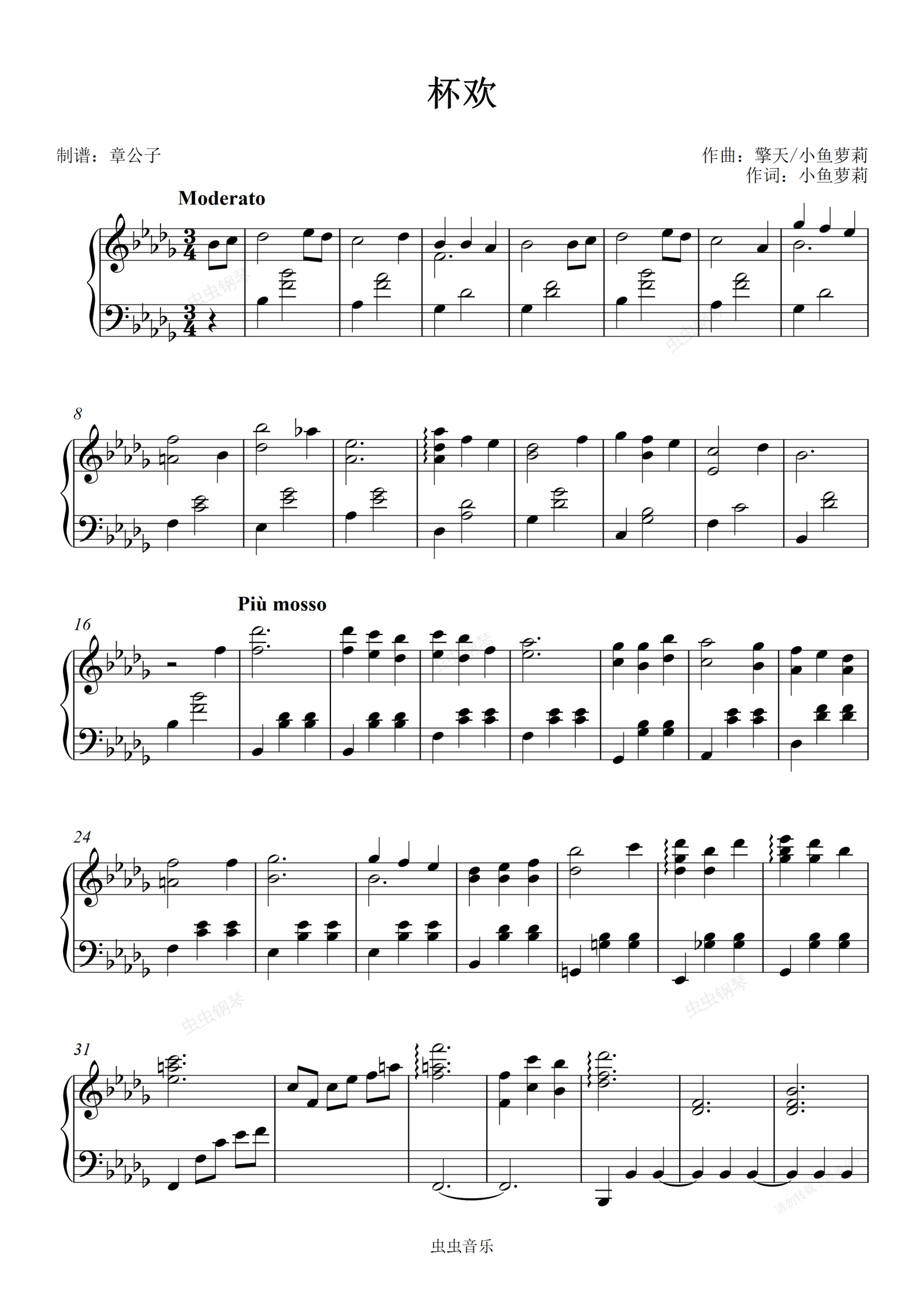 钢琴谱:《杯欢》独奏谱 章公子扒谱自昼夜版