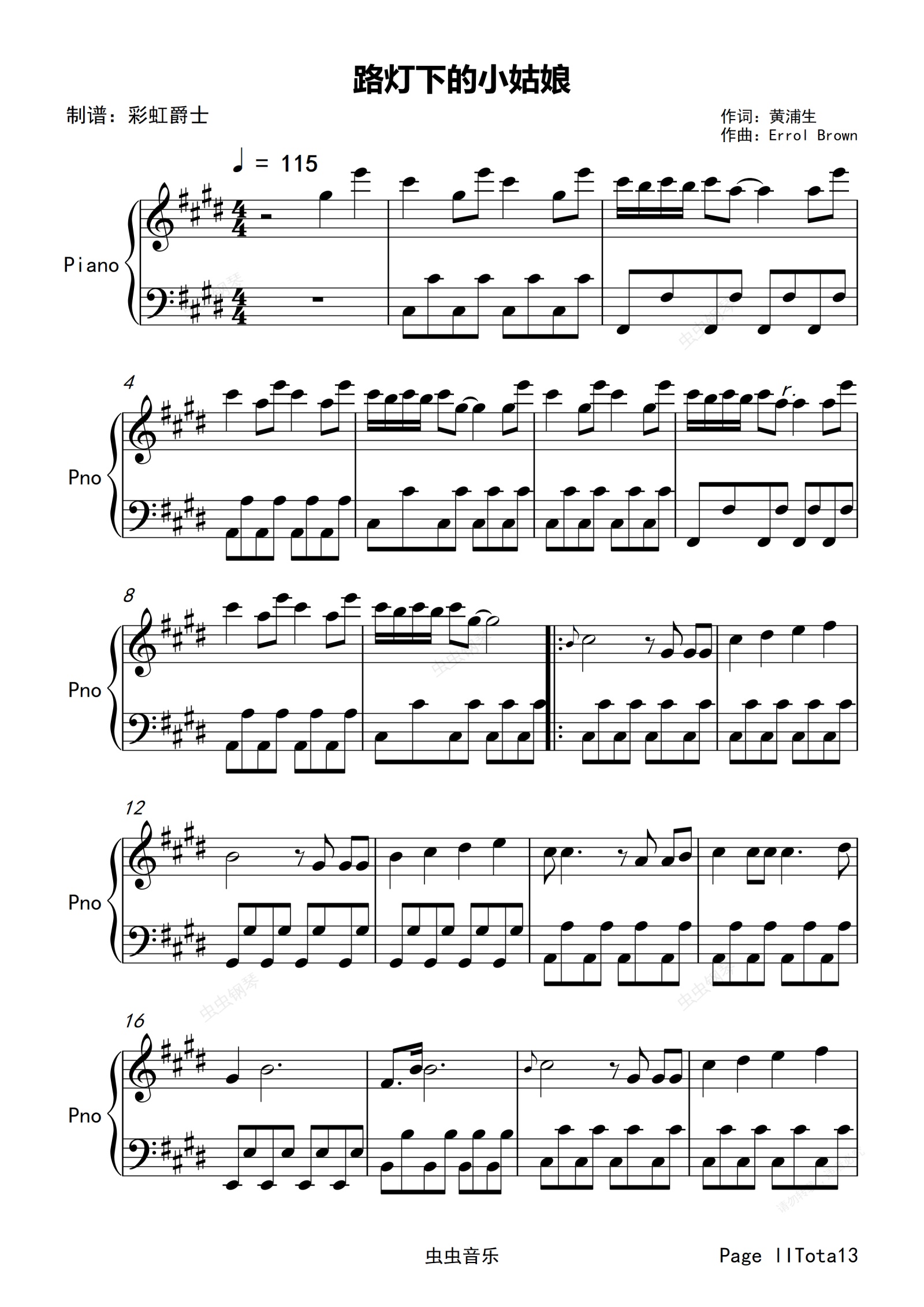 钢琴谱:路灯下的小姑娘 Brother Louie 邓洁仪 Modern Talking