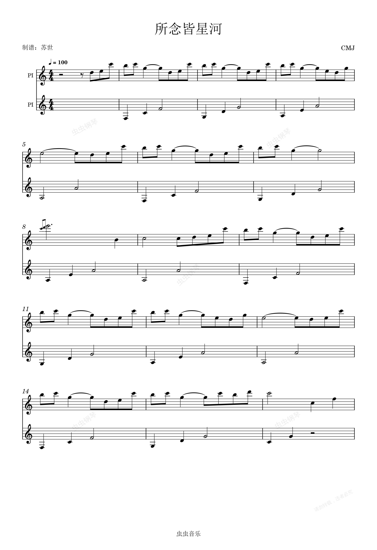 钢琴谱:所念皆星河 C调简易版