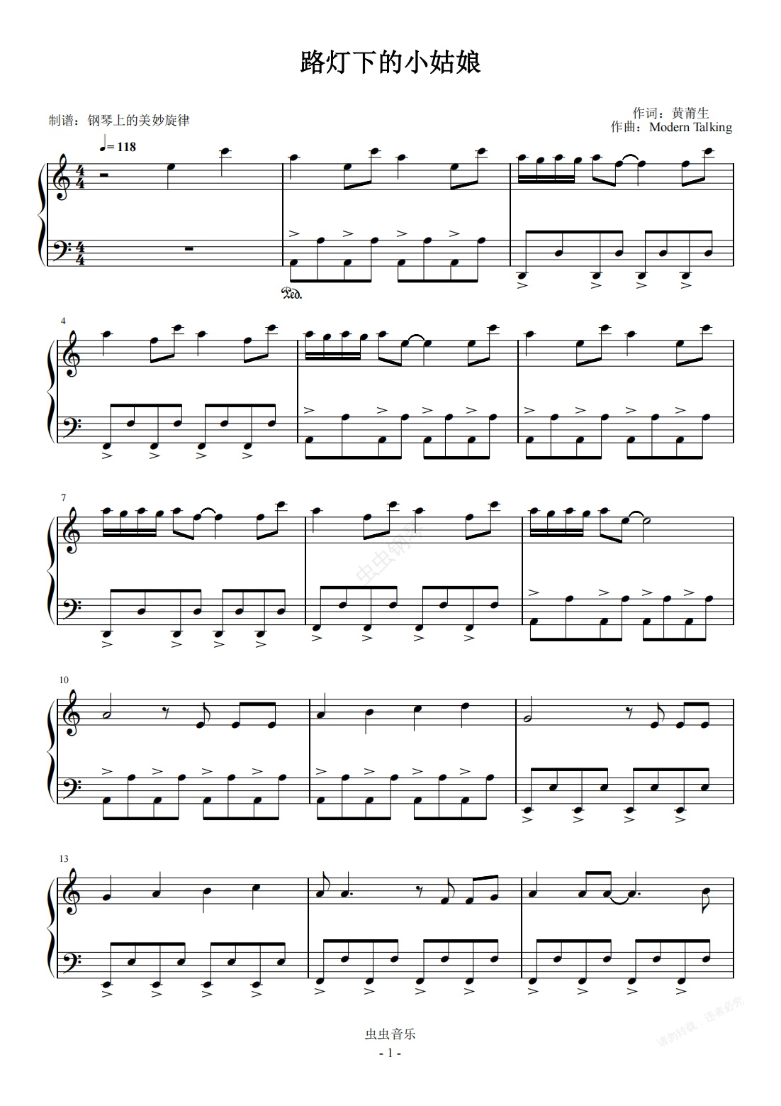 钢琴谱:路灯下的小女孩 C调简易版 邓洁仪
