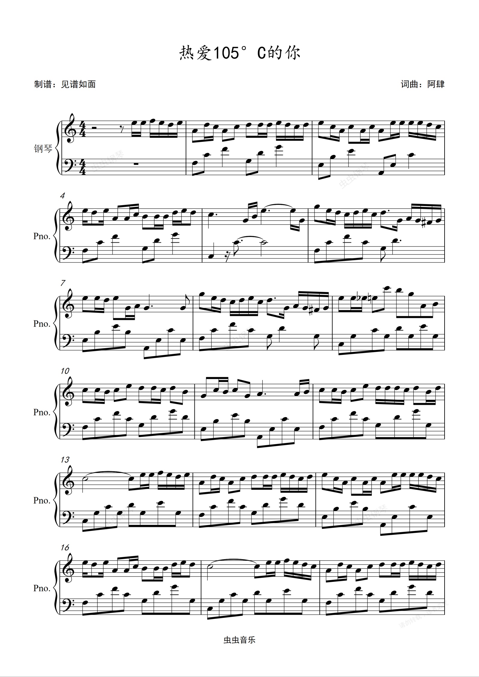 钢琴谱:热爱105°C的你— 阿肆【C调初级】