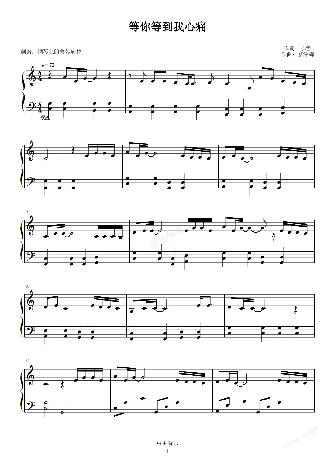 钢琴谱:等你等到我心痛 C调简易版 张学友