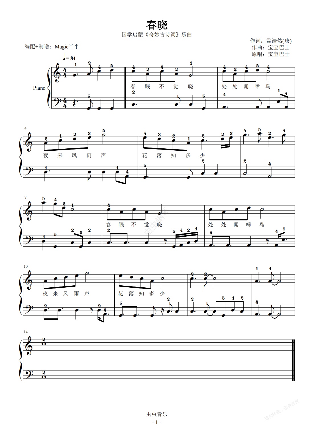 钢琴谱:奇妙古诗词/春晓(带指法)