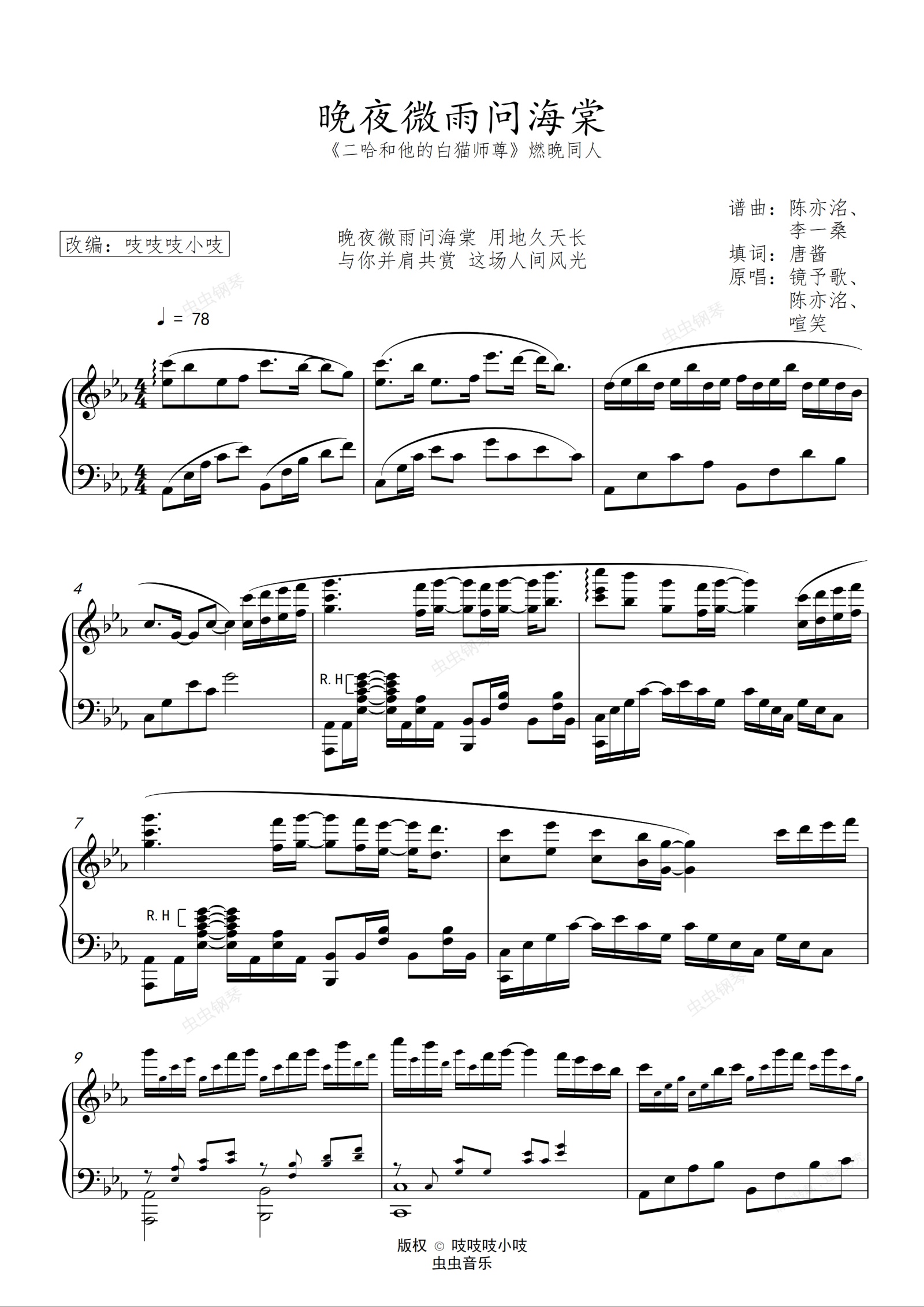 钢琴谱:晚夜微雨问海棠 原调改编版 《二哈和他的白猫师尊》