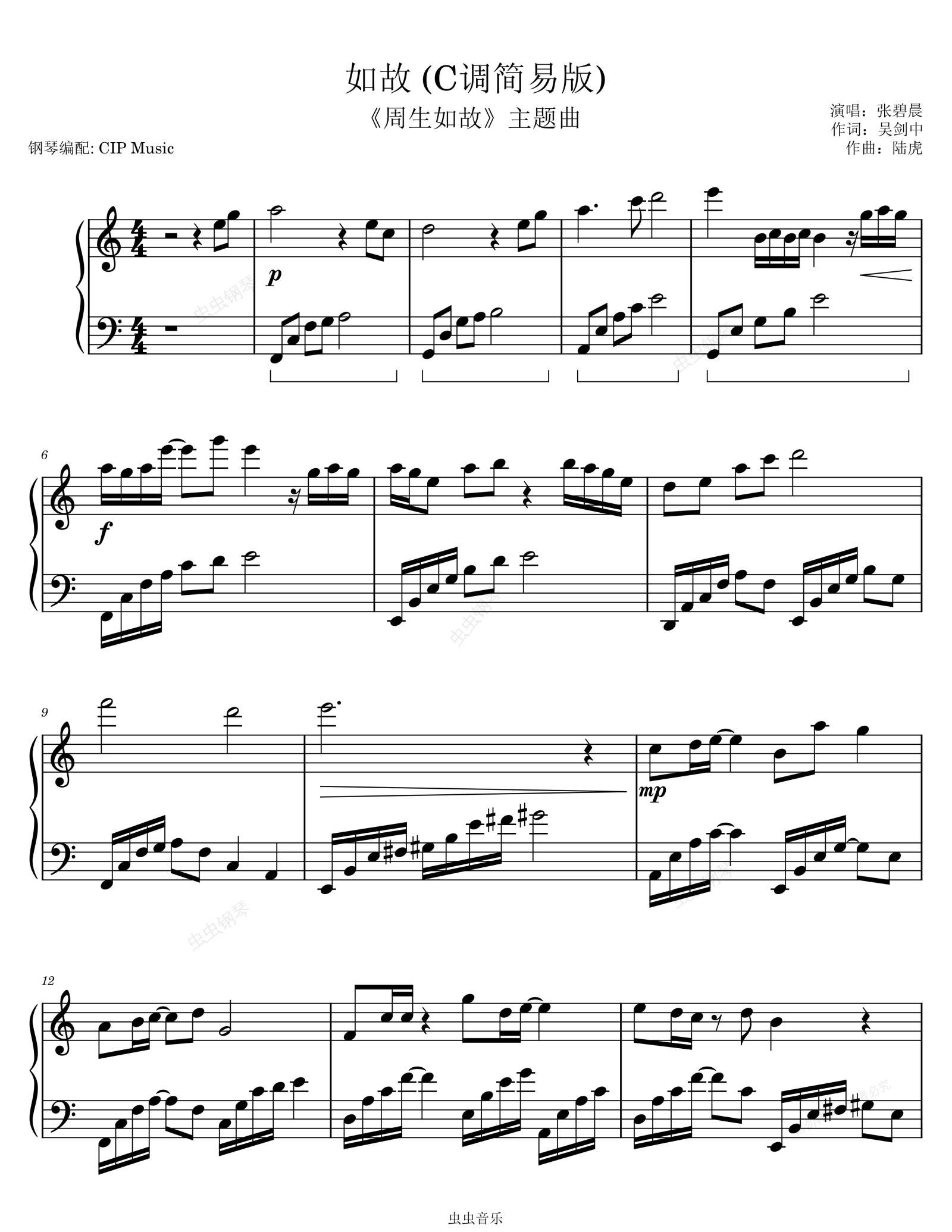 钢琴谱:《如故》C调简易版 - 电视剧《周生如故》主题曲