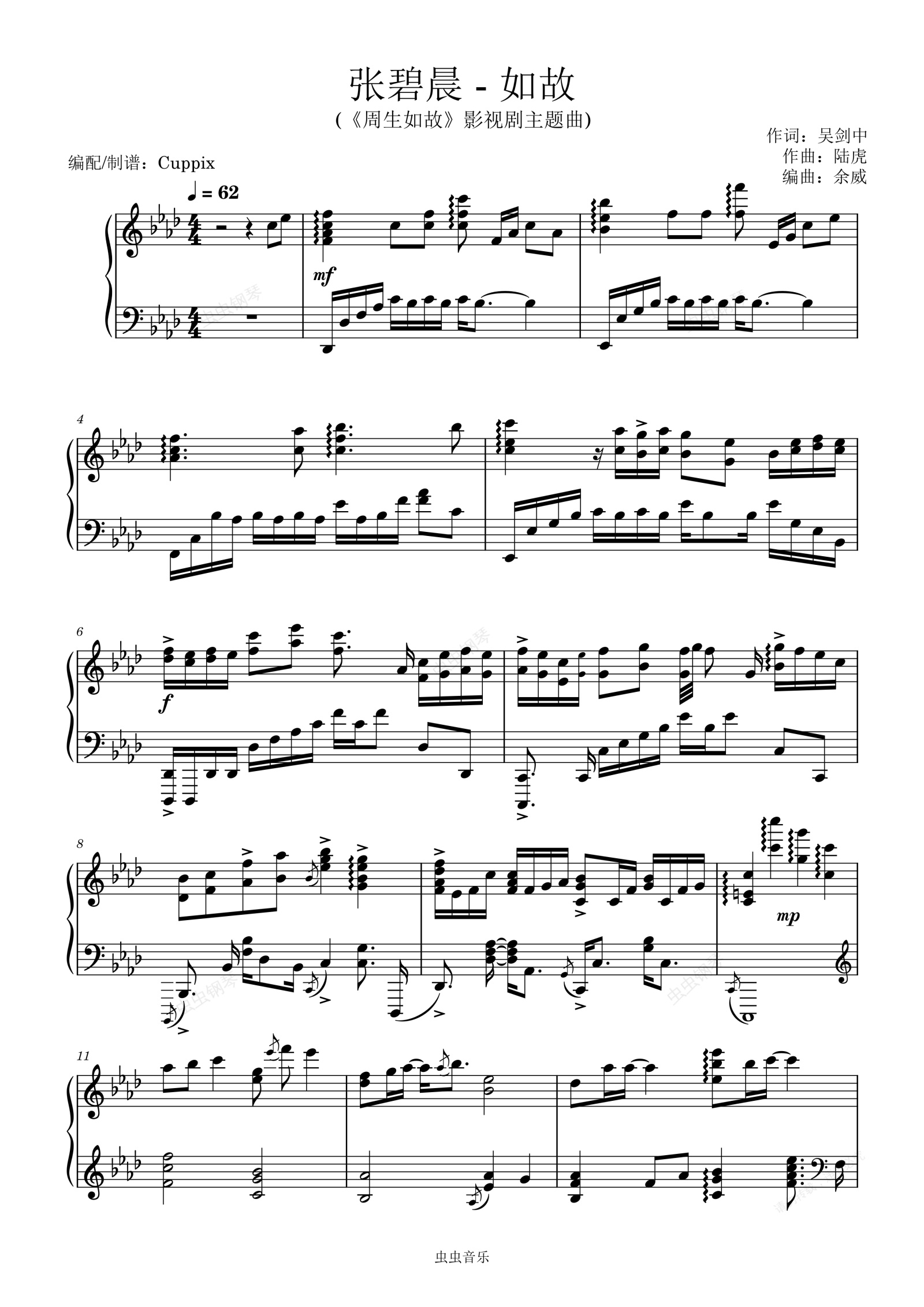 钢琴谱:张碧晨《如故》Cuppix编配-极致还原(《周生如故》影视剧主题曲)