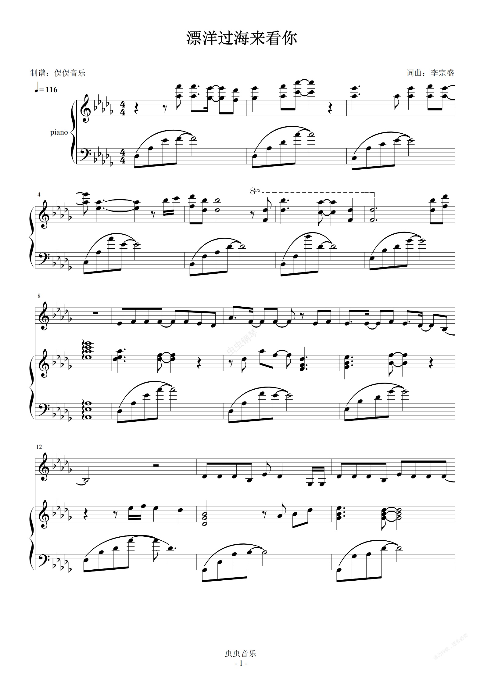 钢琴谱:刘明湘-漂洋过海来看你(弹唱谱)