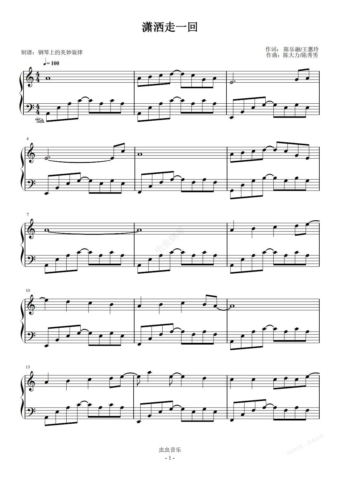 钢琴谱:潇洒走一回 C调简易版本 叶倩文