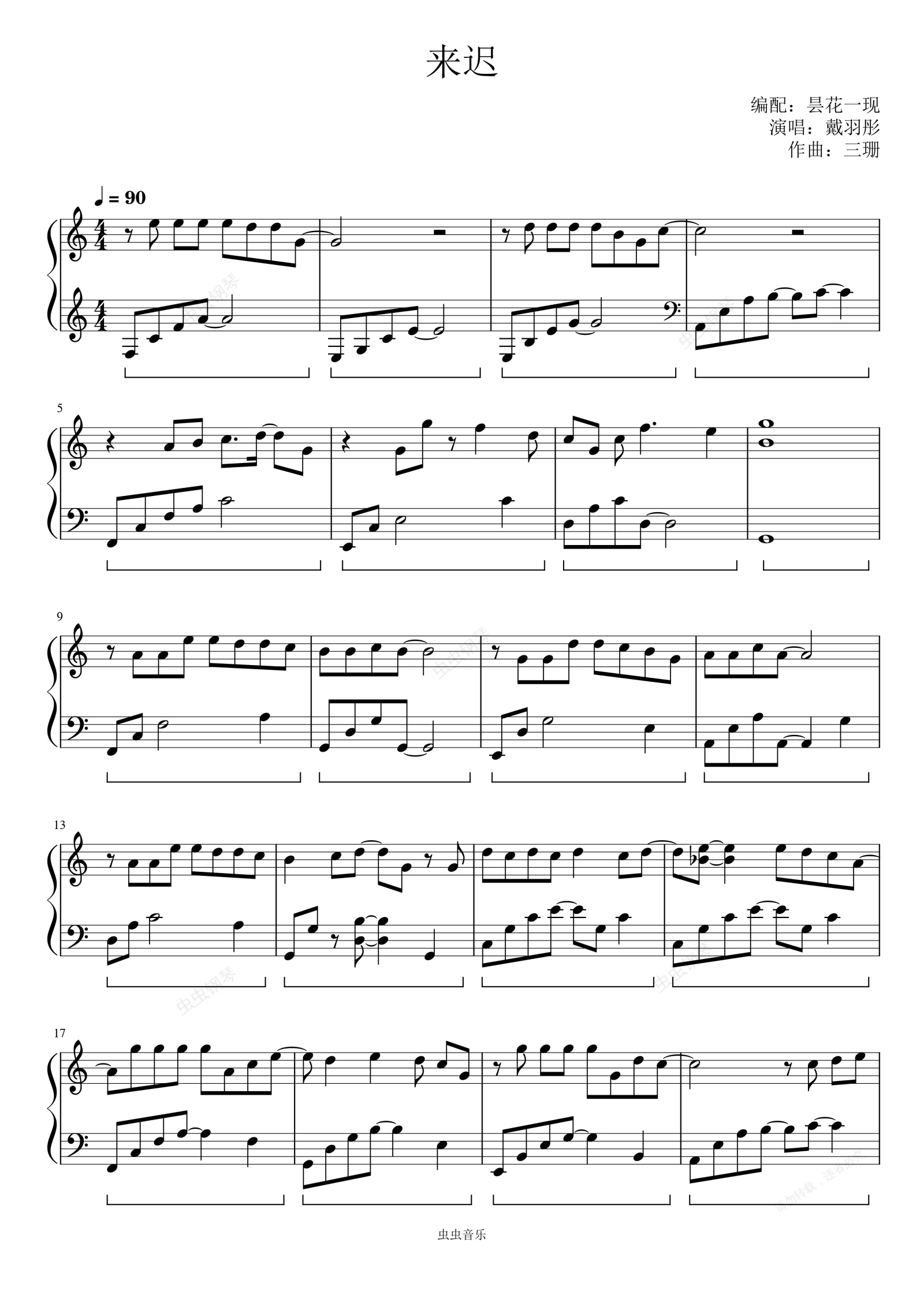 钢琴谱:来迟 戴羽彤 C大调简化版 抖音热曲