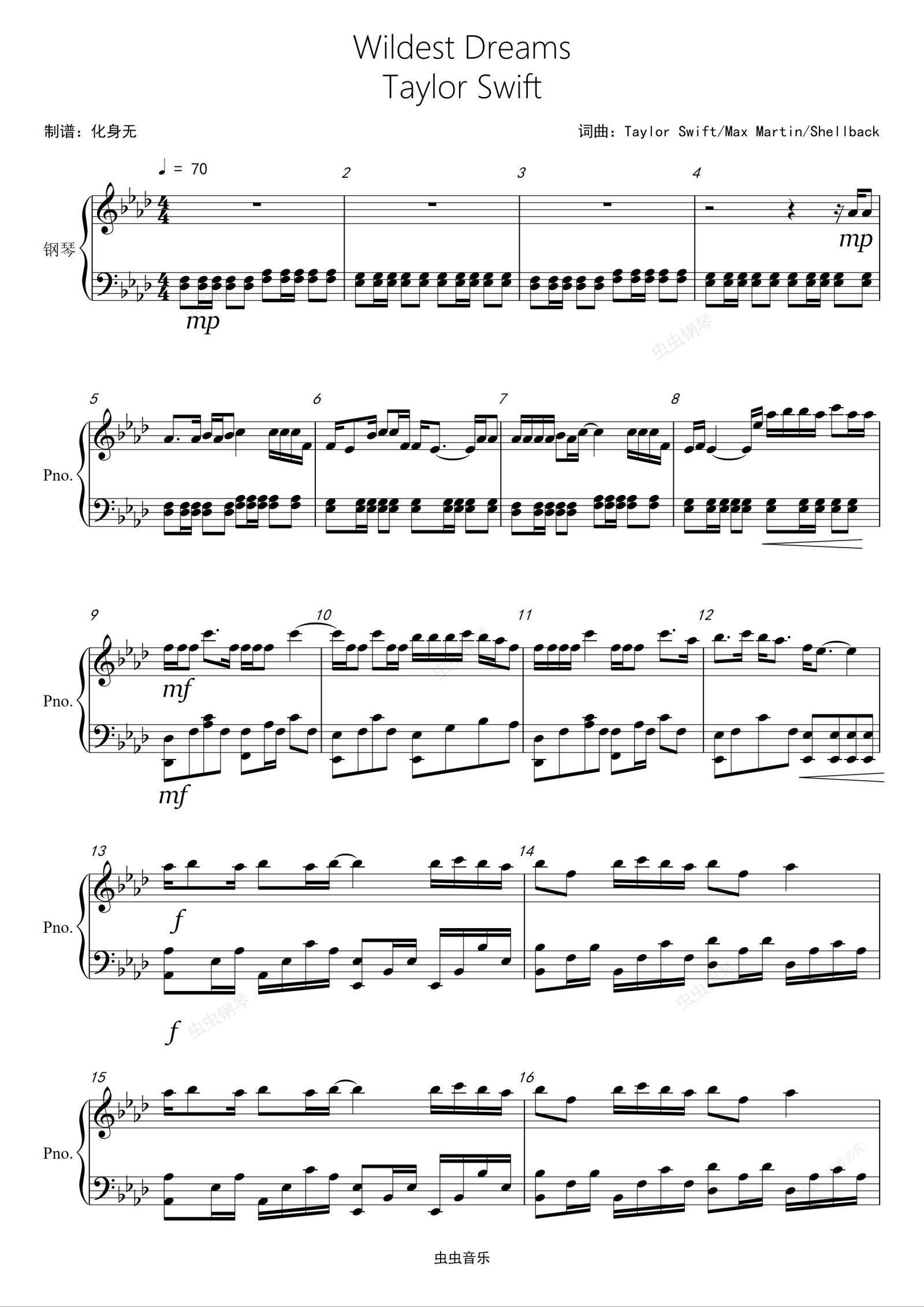 钢琴谱:Wildest Dreams 原调独奏版