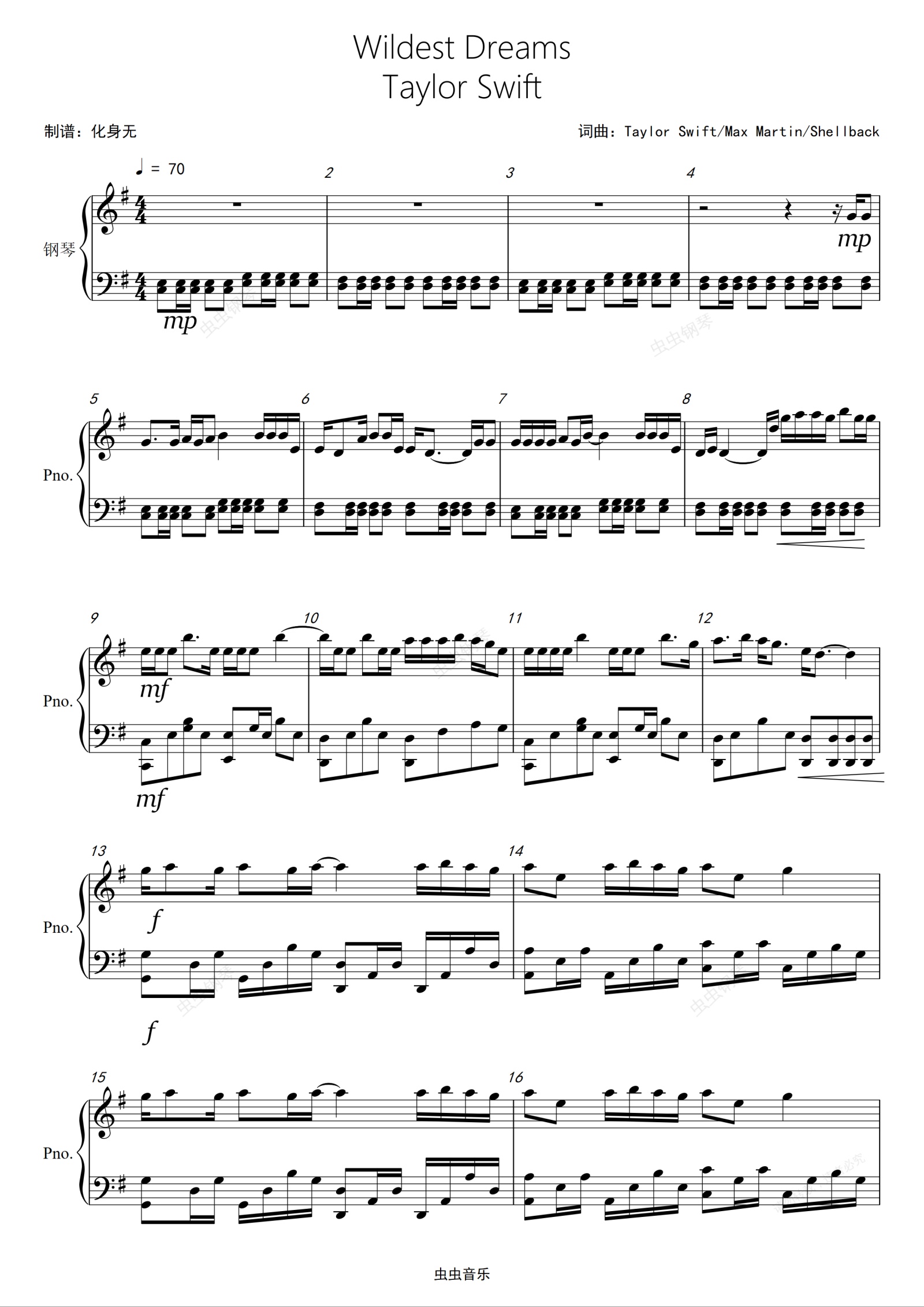 钢琴谱:Wildest Dreams G调独奏版
