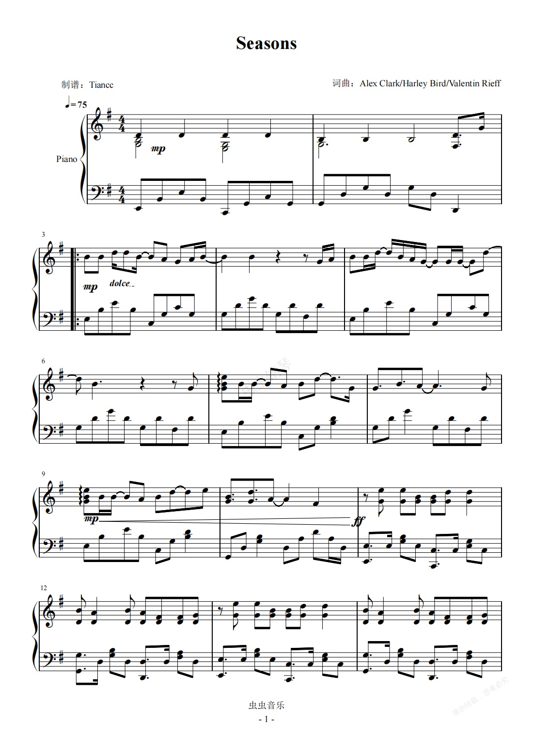 钢琴谱:《Seasons》G调,好听,并不难~849难度