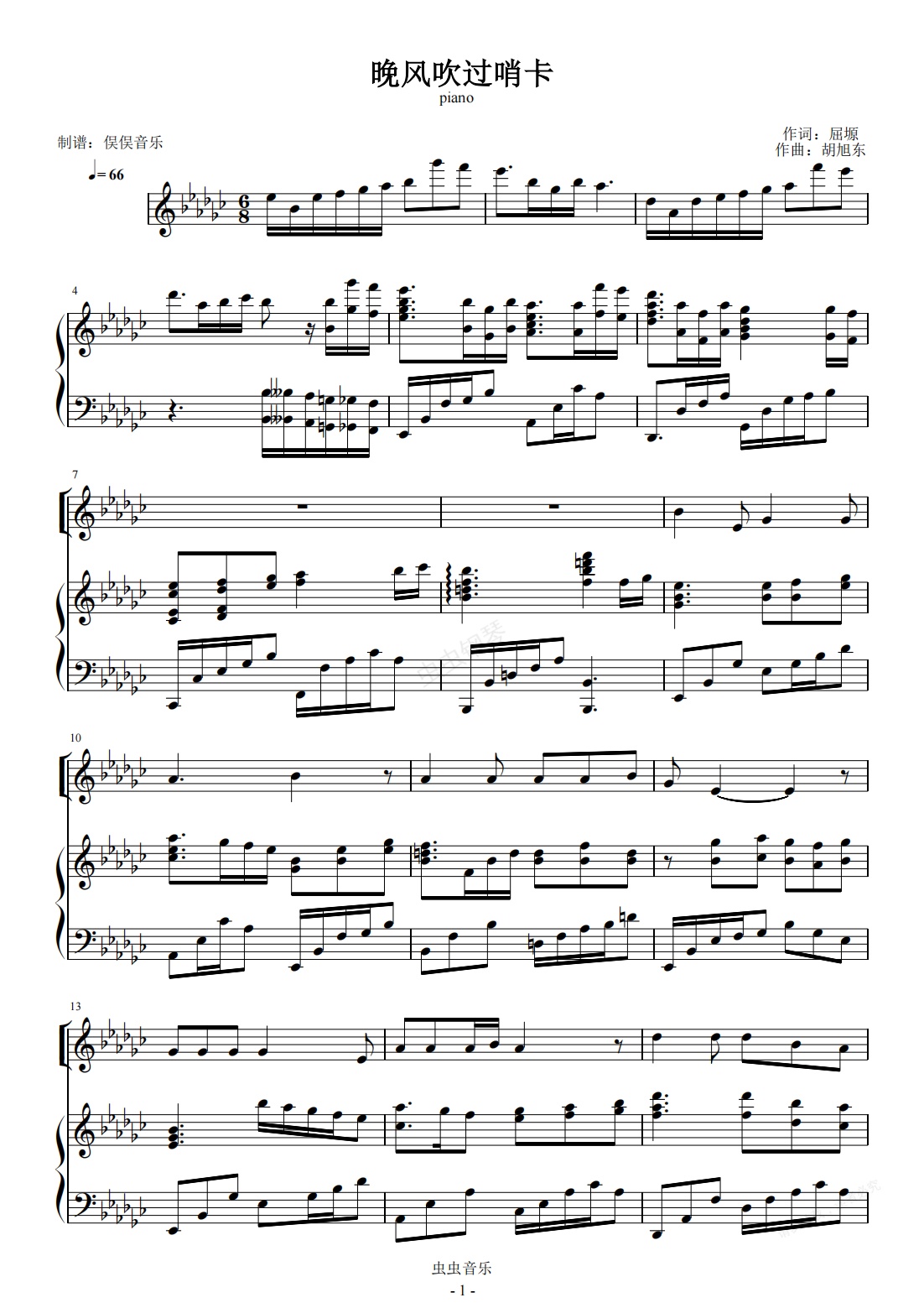 钢琴谱:雷佳-晚风吹过哨卡(弹唱谱)