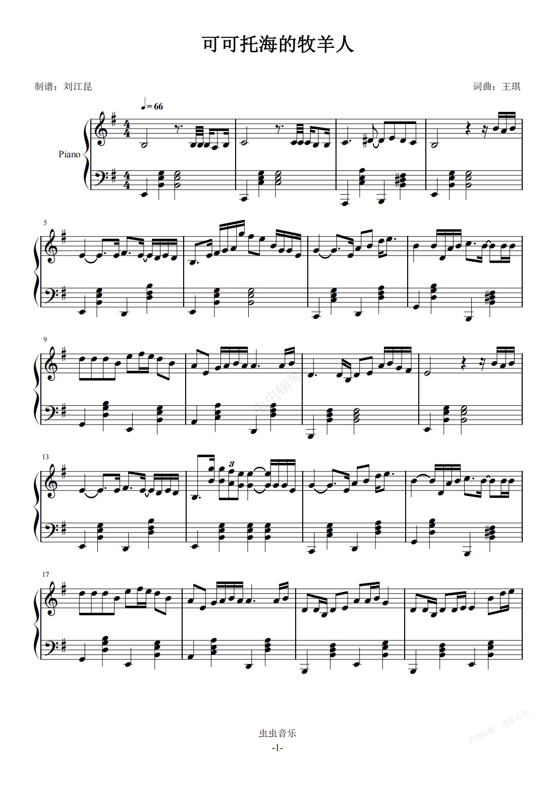 钢琴谱:可可托海的牧羊人(G调稍简易版)