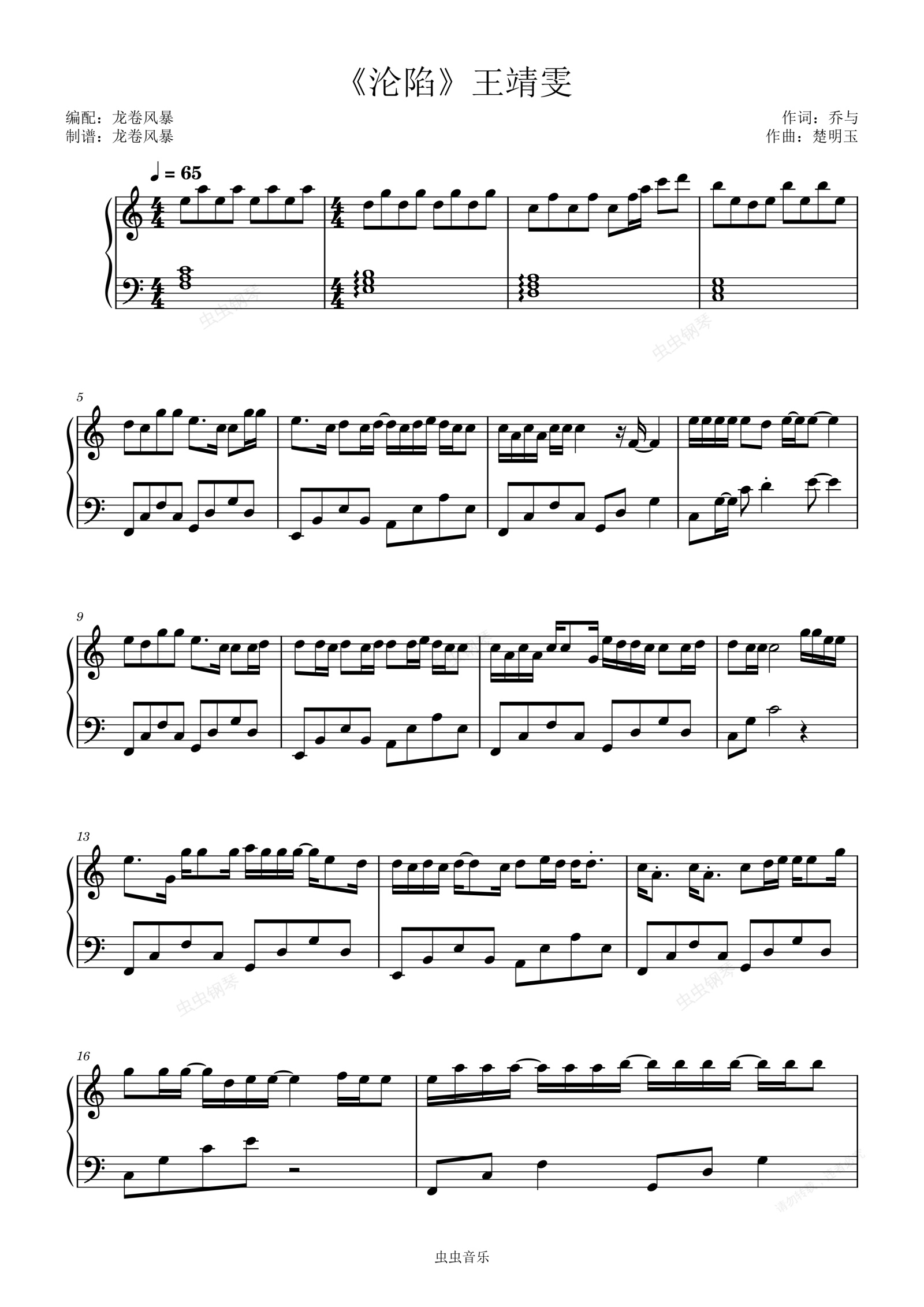 钢琴谱:《沦陷》王靖雯不胖(C调简单版)