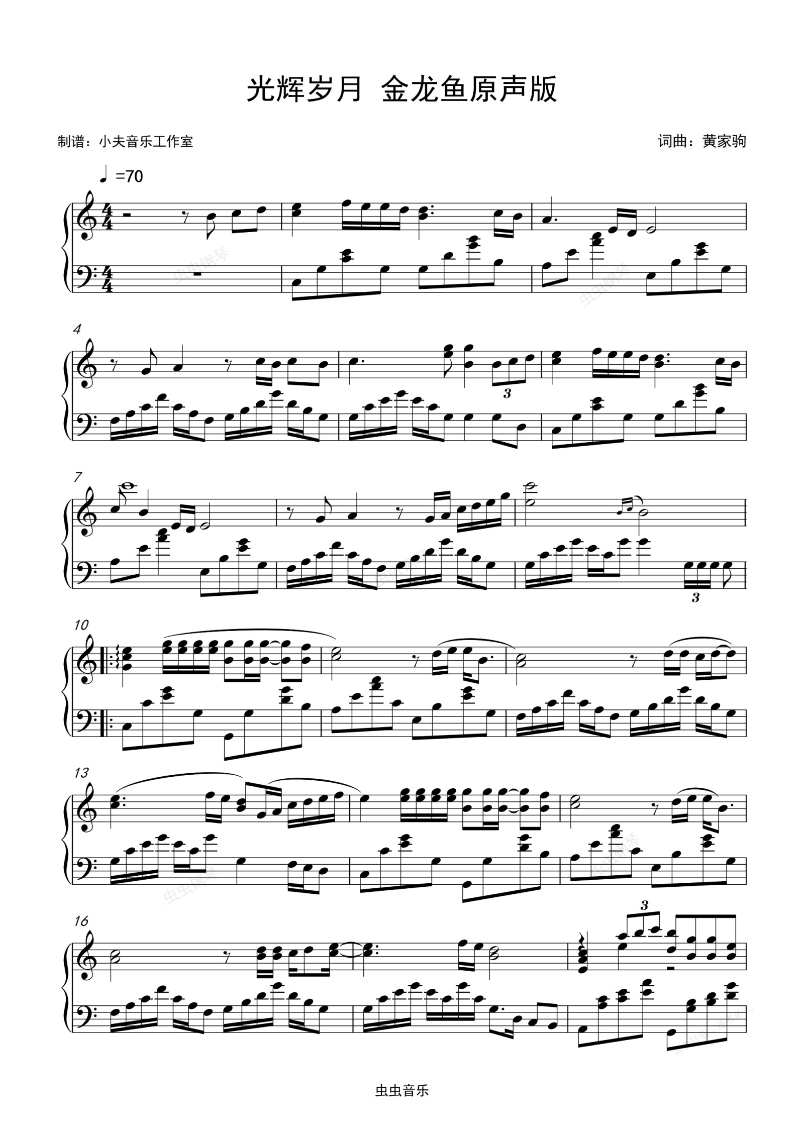 钢琴谱:光辉岁月 金龙鱼原声版 C调译谱