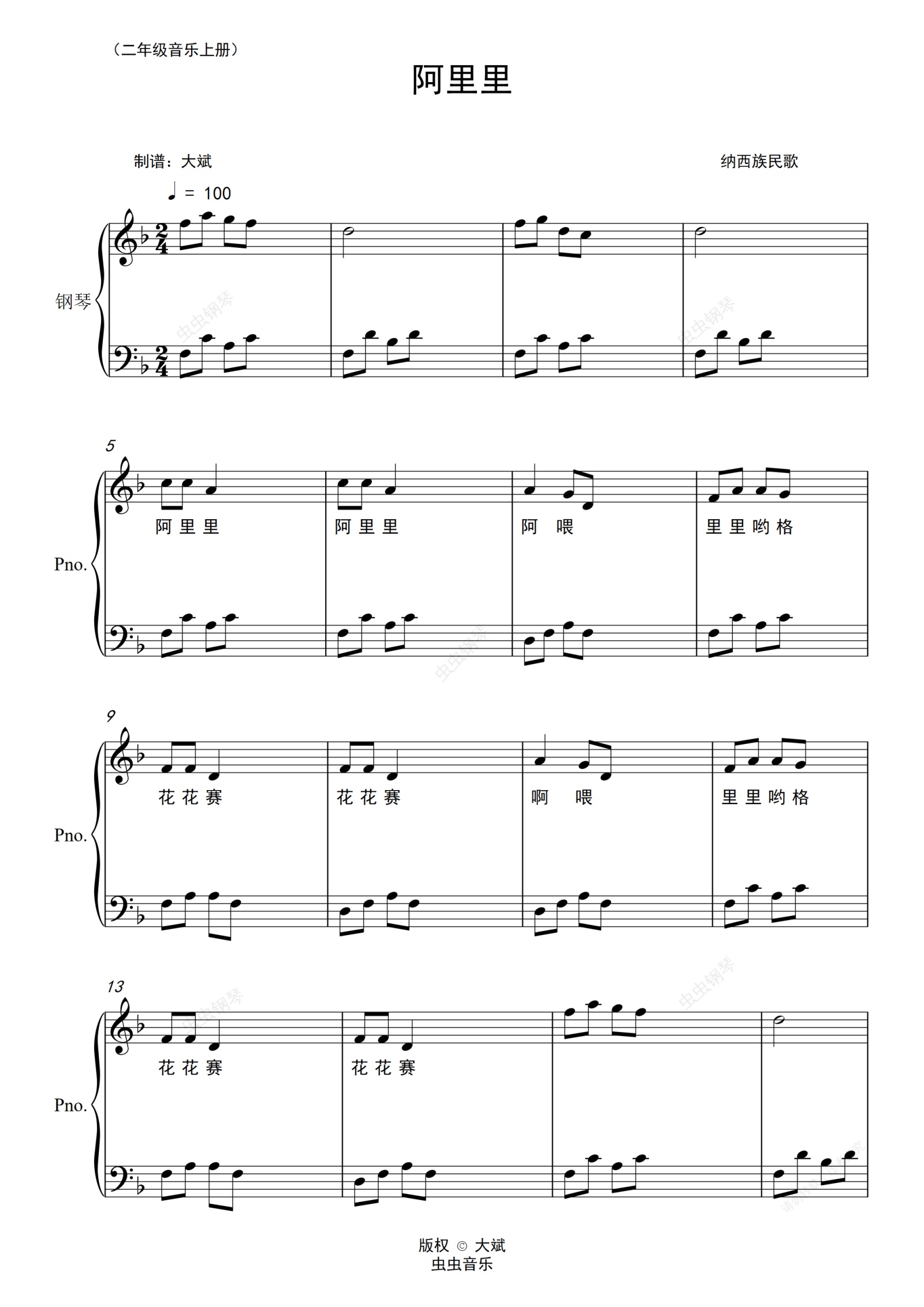 钢琴谱:《阿里里》二年级音乐上册