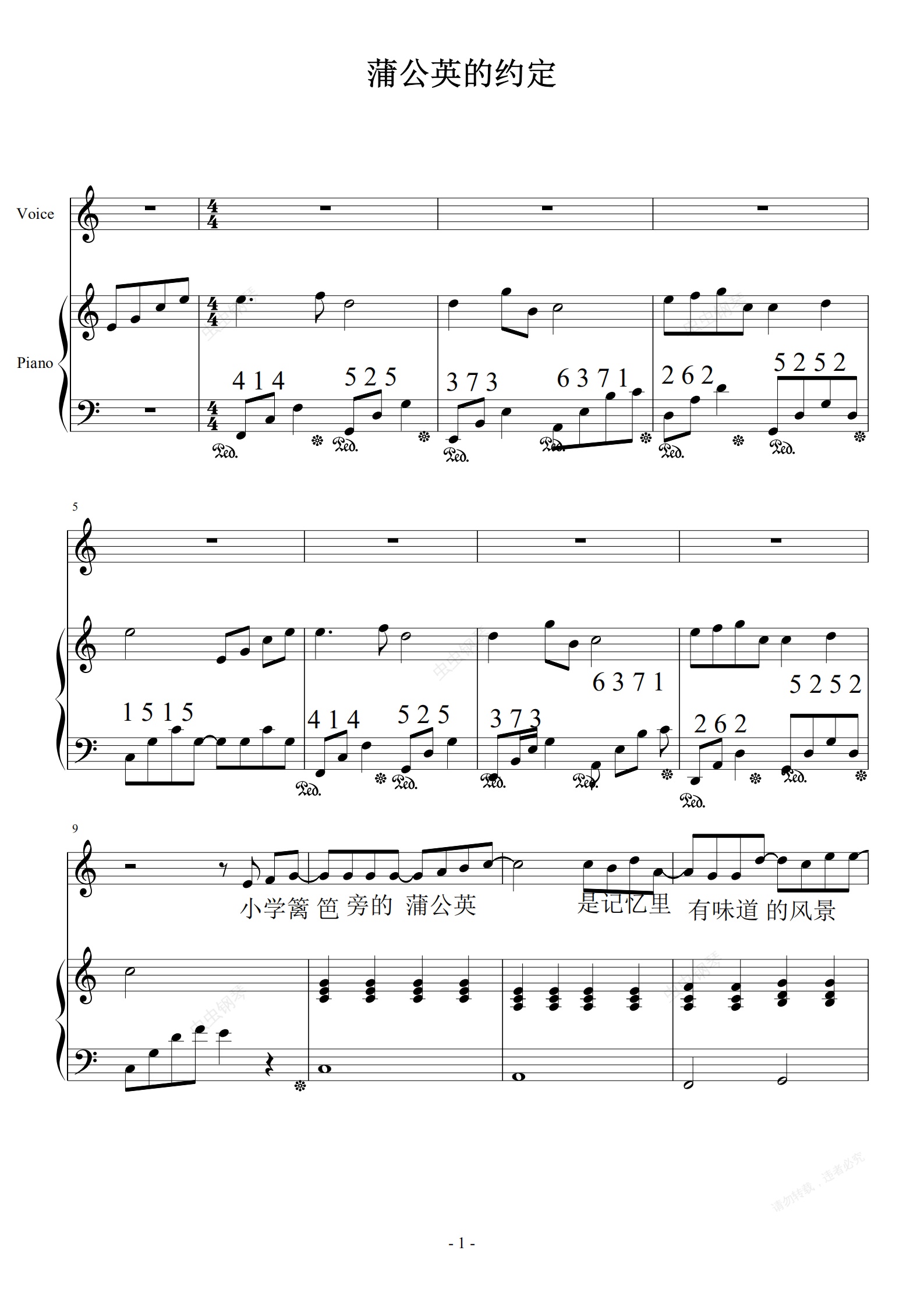 钢琴谱:《蒲公英的约定》弹唱—简版
