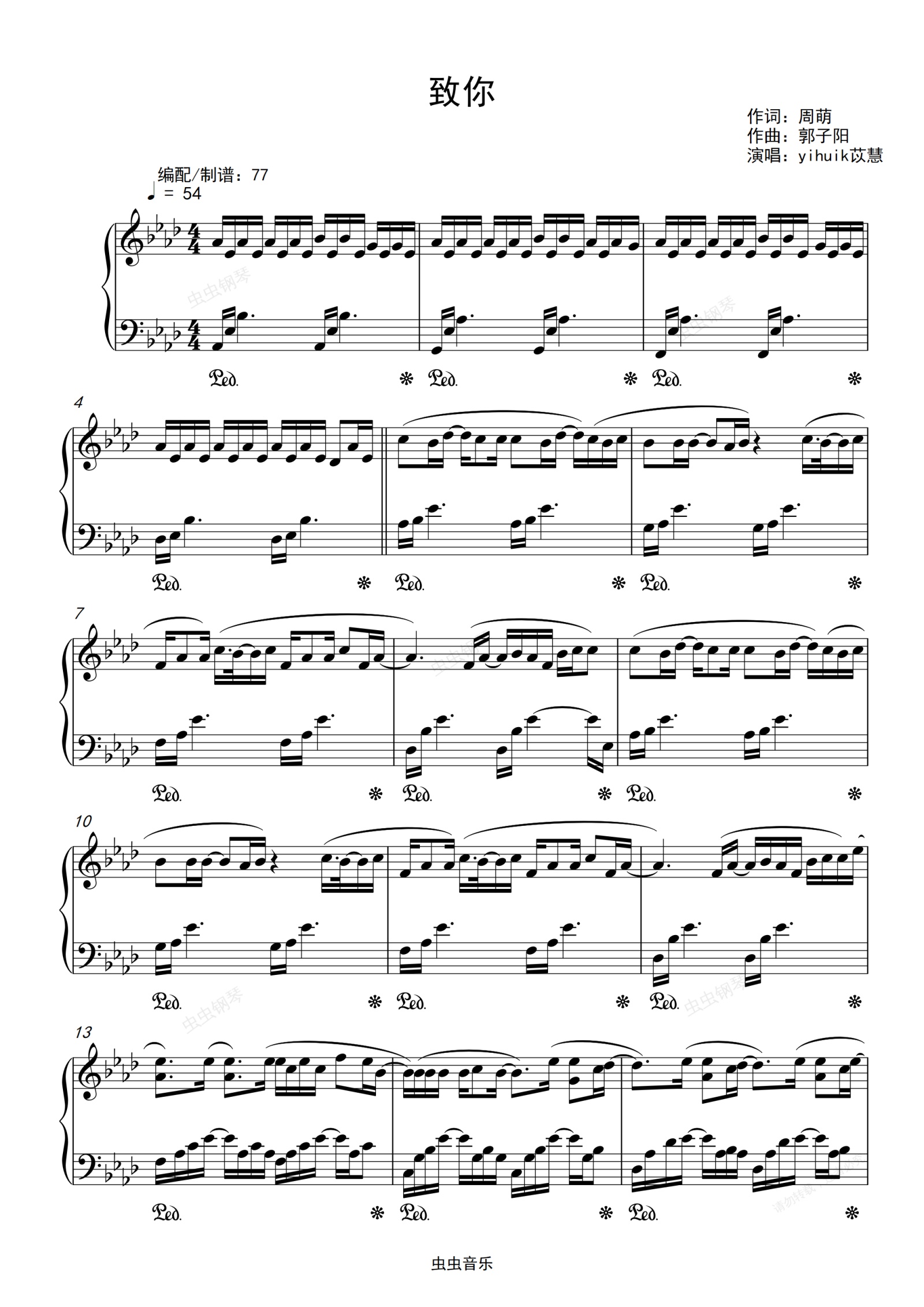 钢琴谱:yihuik苡慧 - 《致你》钢琴独奏 高度还原