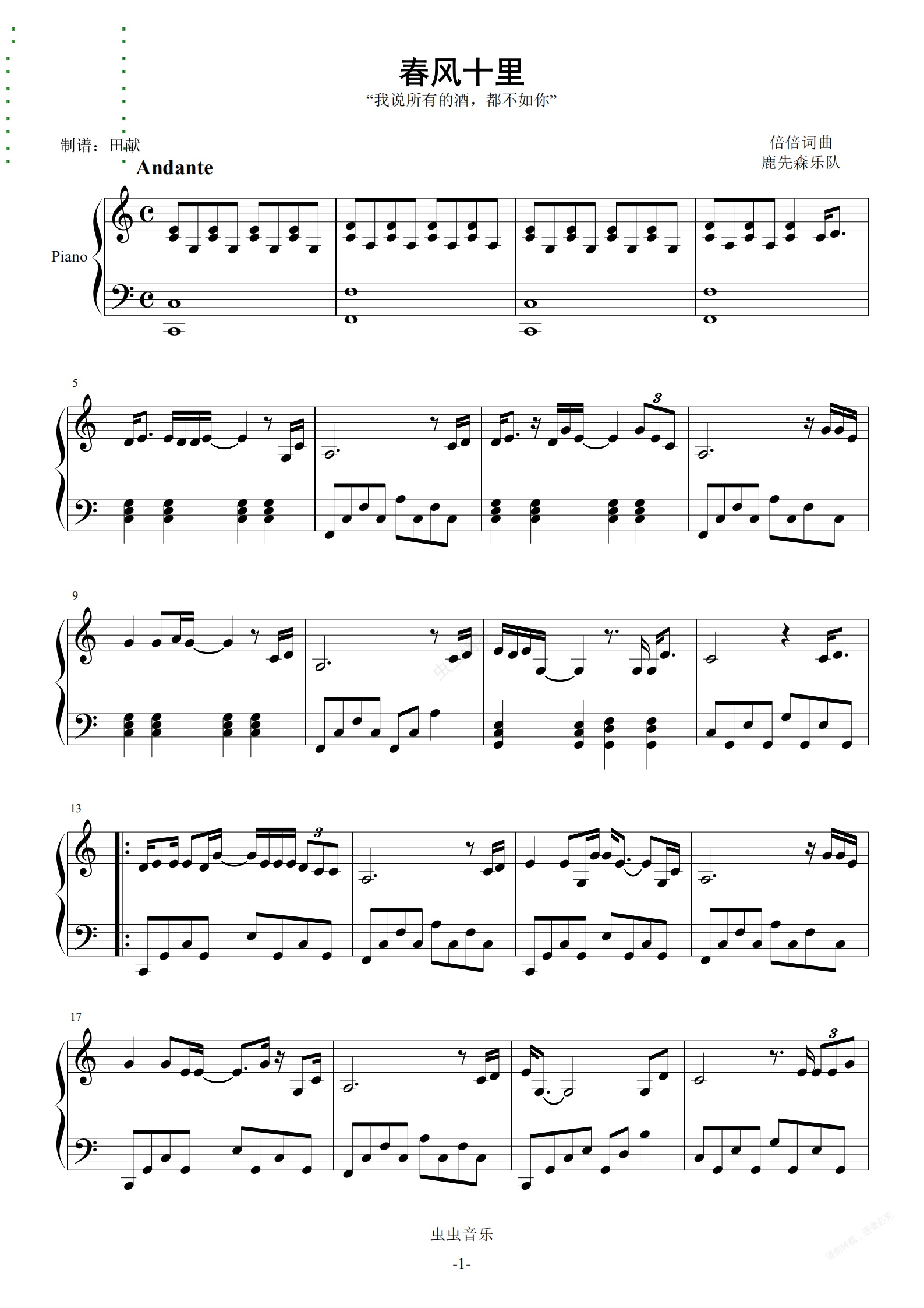 钢琴谱:春风十里(C调简单版)