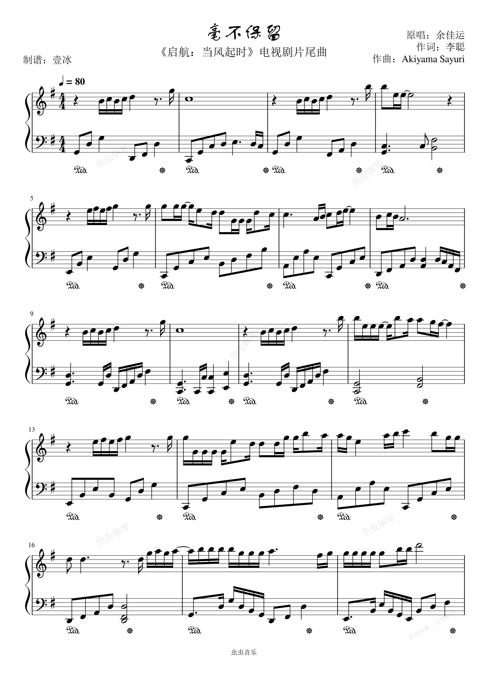 钢琴谱:毫不保留//《启航:当风起时》片尾曲