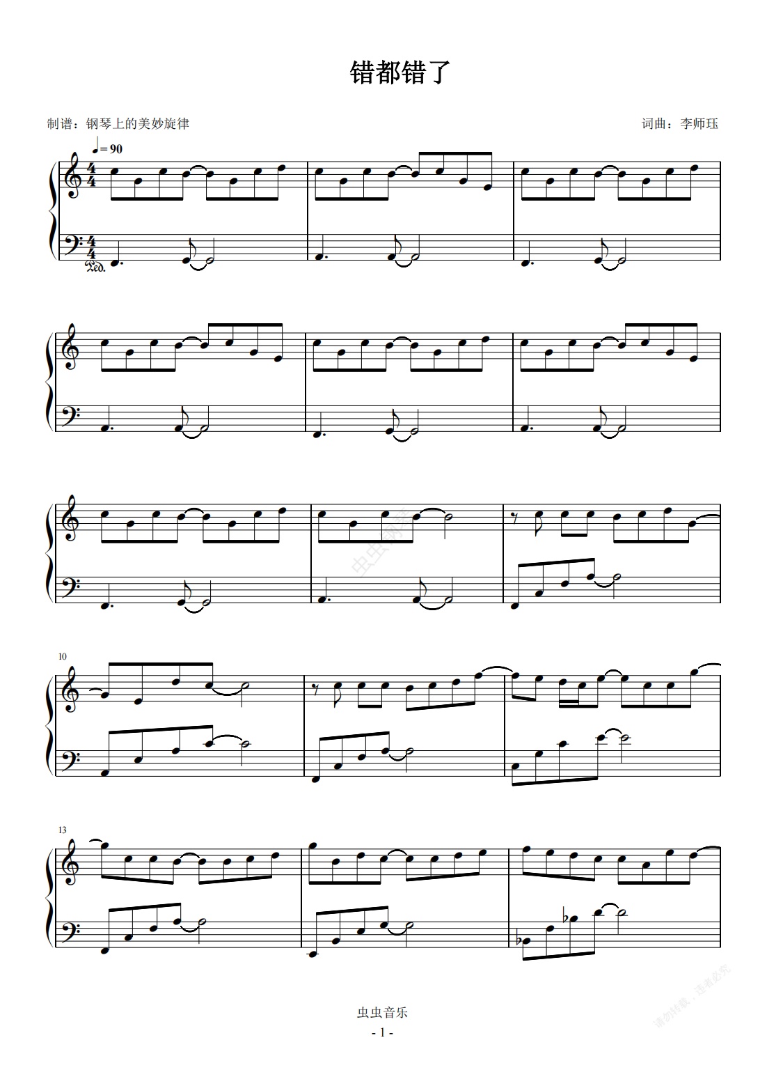 钢琴谱:错都错了 C调简易版 赵乃吉