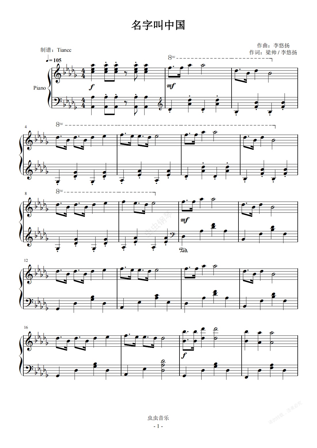 钢琴谱:《名字叫中国》有个国家他很伟大,599难度