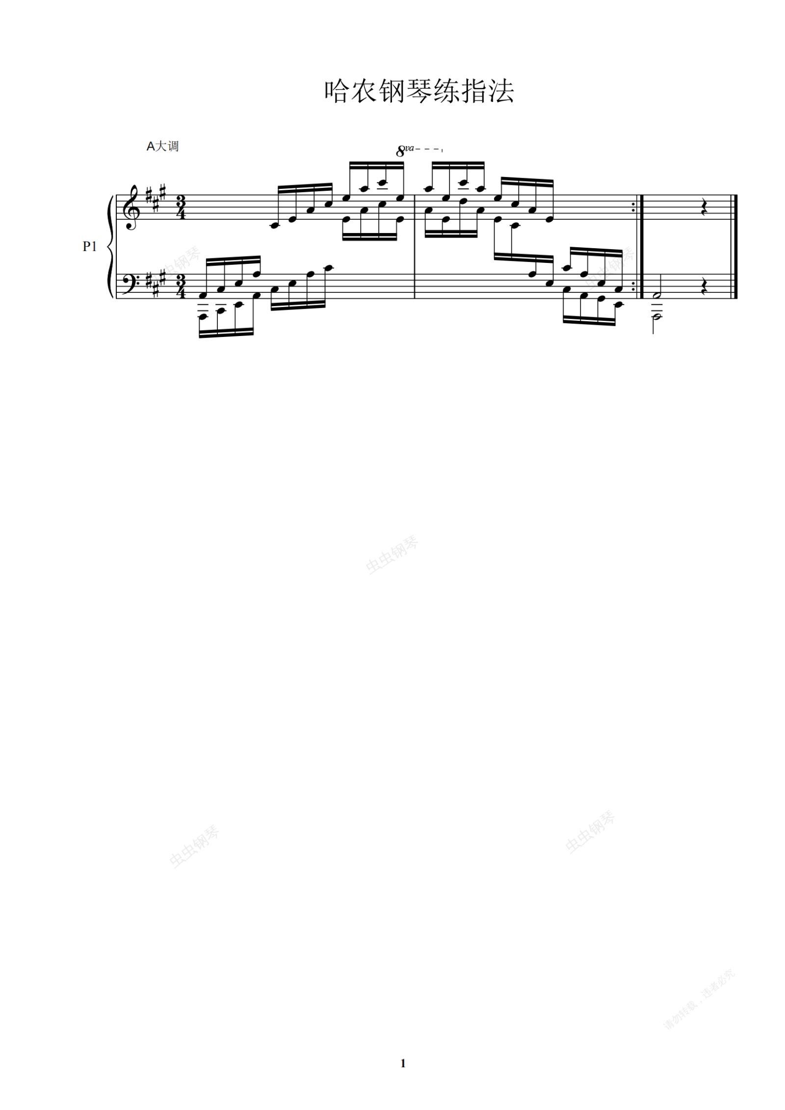 钢琴谱:哈农 No.41-19 A大调主三和弦琶音
