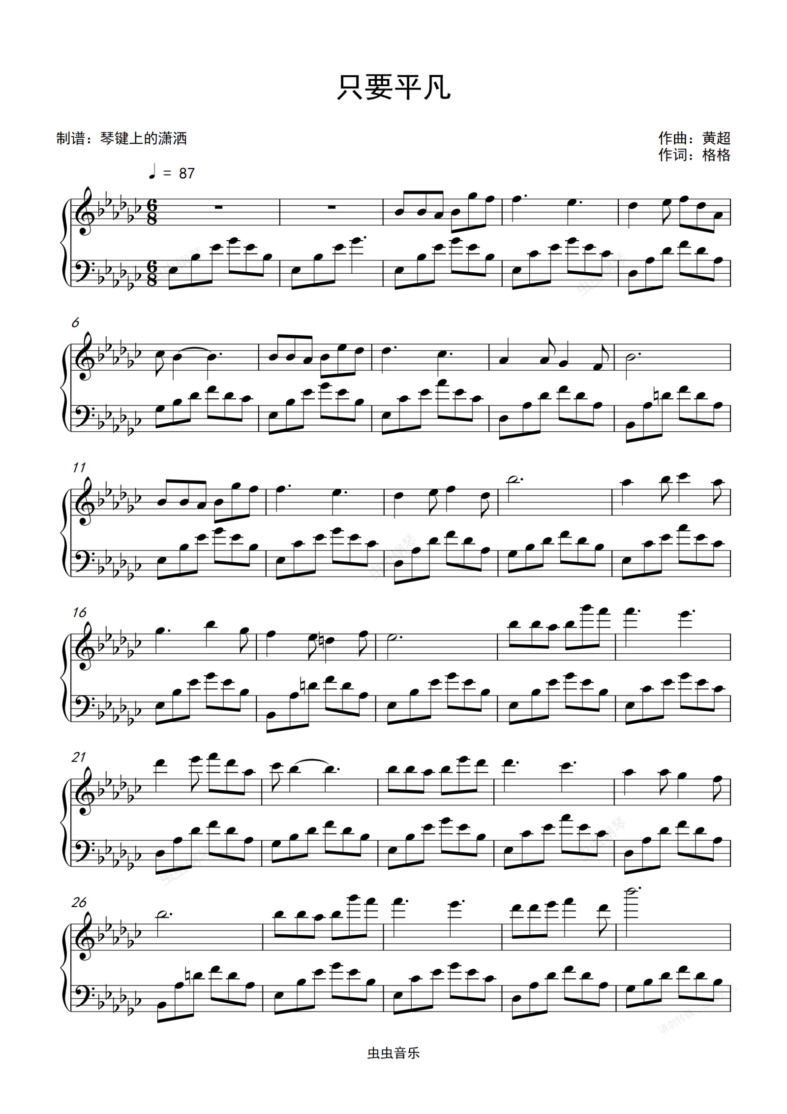 钢琴谱:《只要平凡》-张杰、张碧晨-完美降e小调独奏