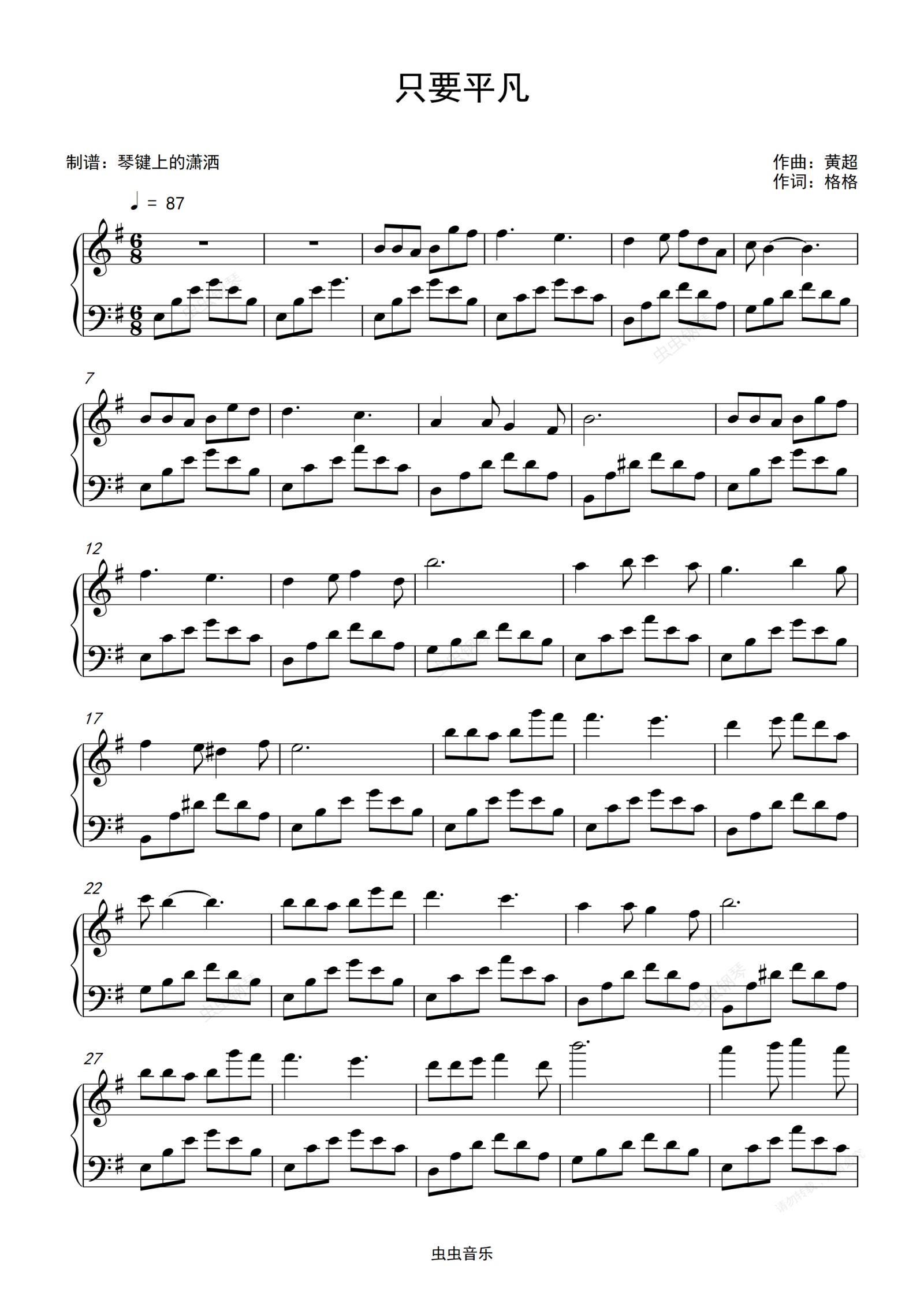 钢琴谱:《只要平凡》-张杰、张碧晨-完美e小调独奏
