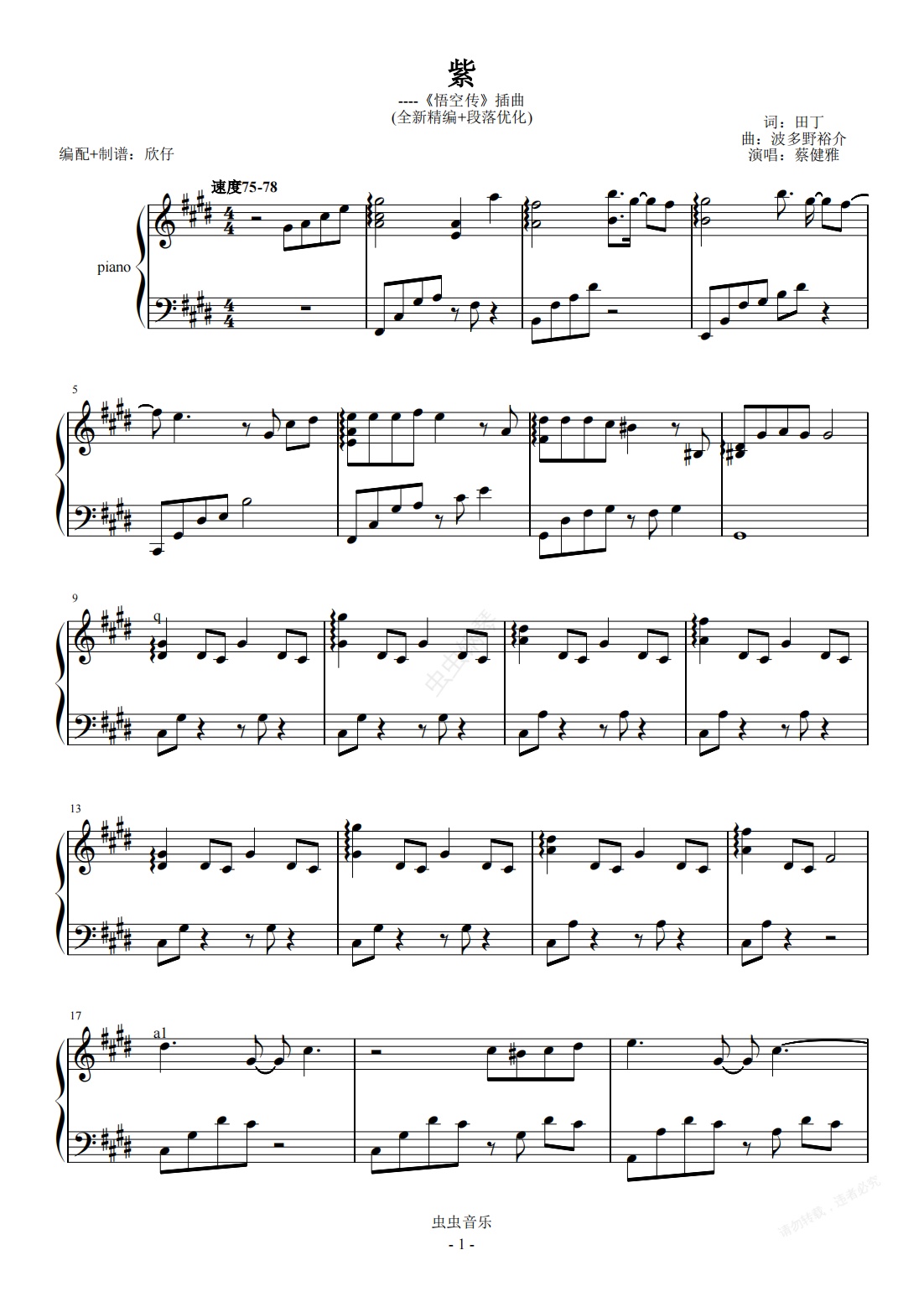 钢琴谱:蔡健雅-E《紫》(《悟空传》插曲、全新精编+段落优化)