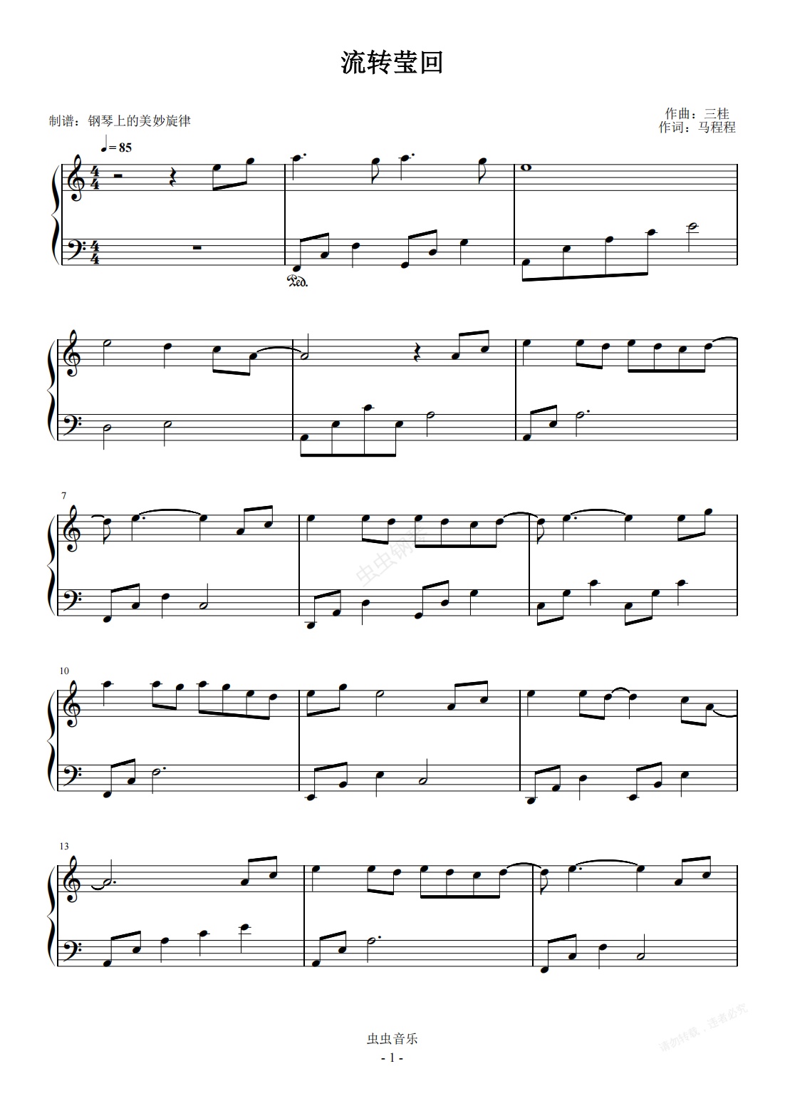 钢琴谱:流转莹回 C调简易版 双笙