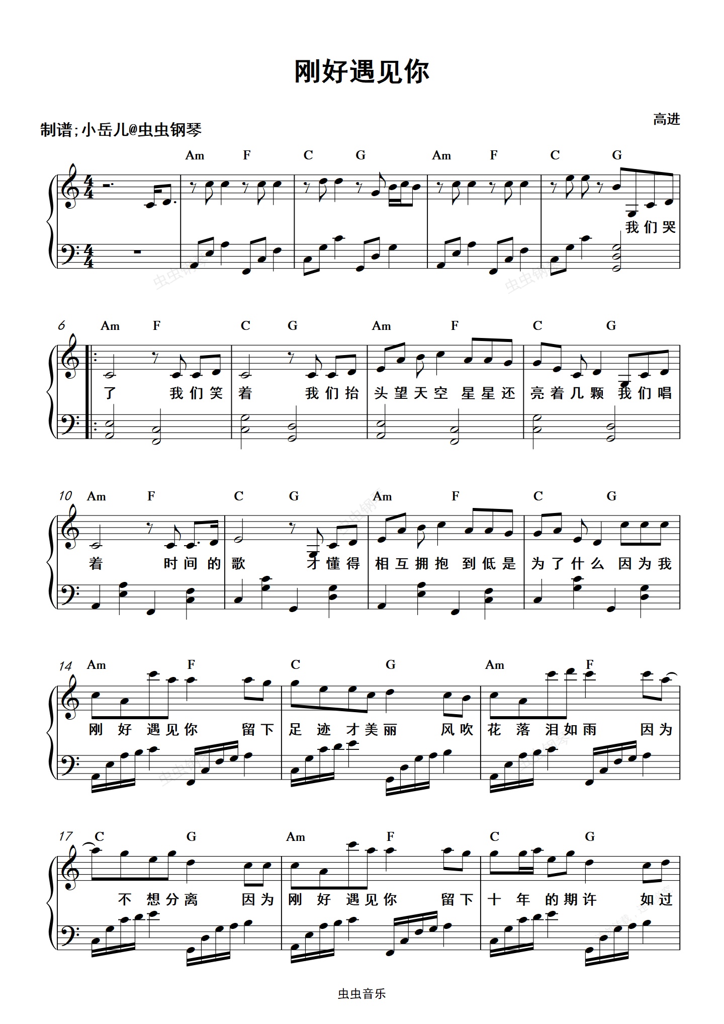 钢琴谱:刚好遇见你 (歌词+和弦)C调简易版