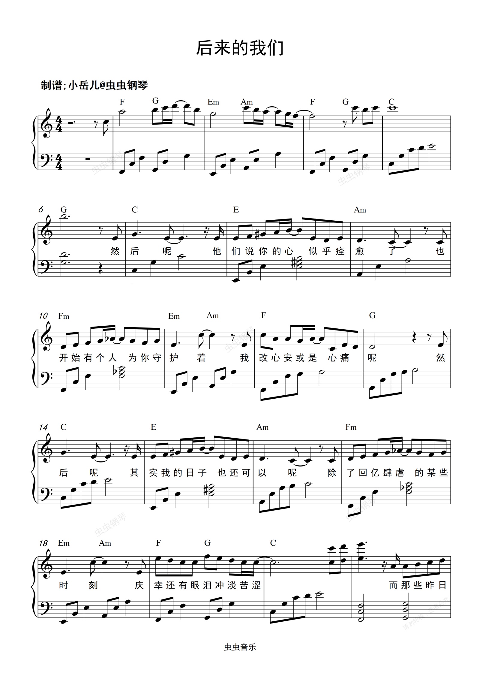 钢琴谱:后来的我们 (歌词+和弦)C调简易版  五月天