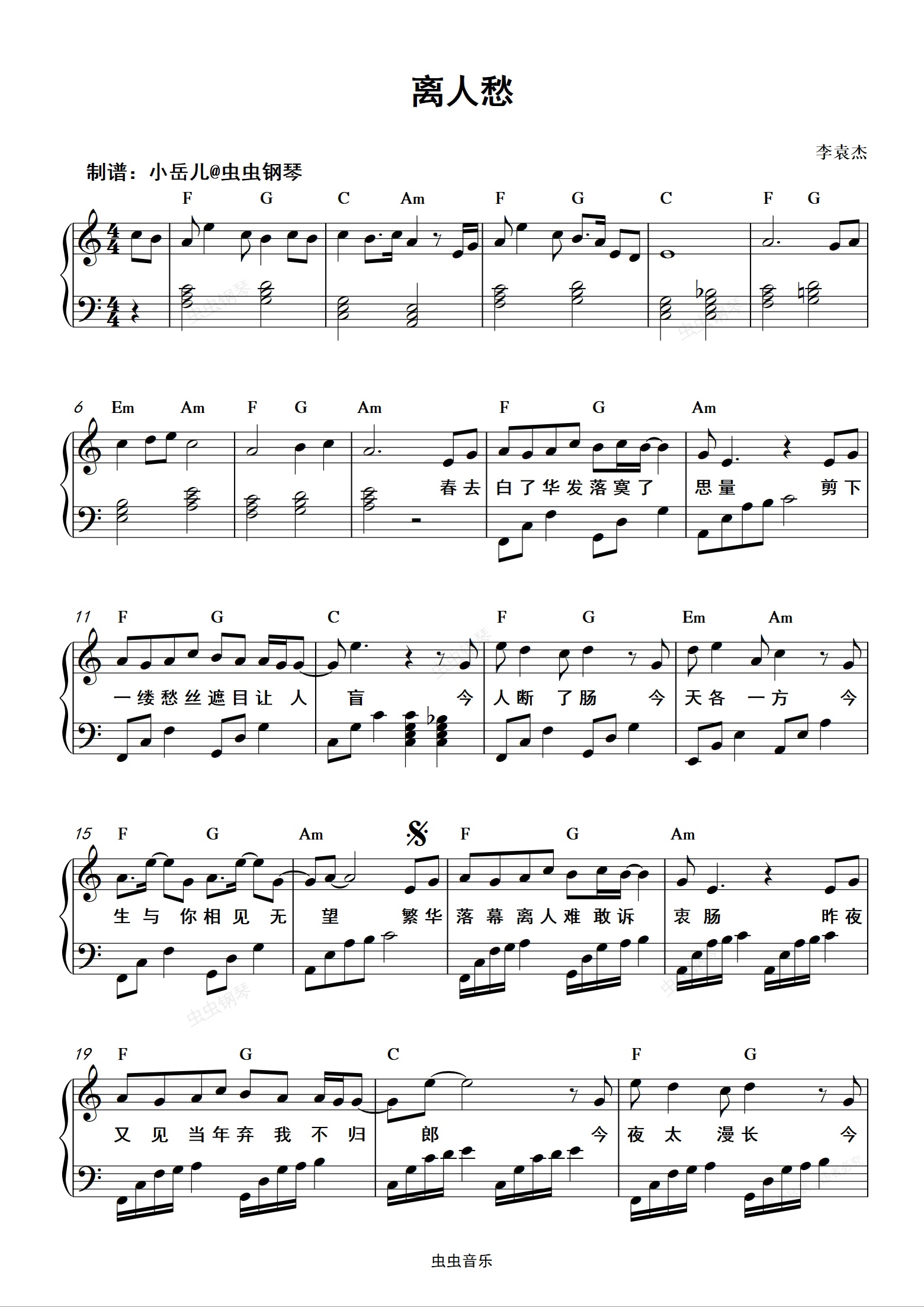 钢琴谱:离人愁 C调简易版(歌词+和弦)好听好弹