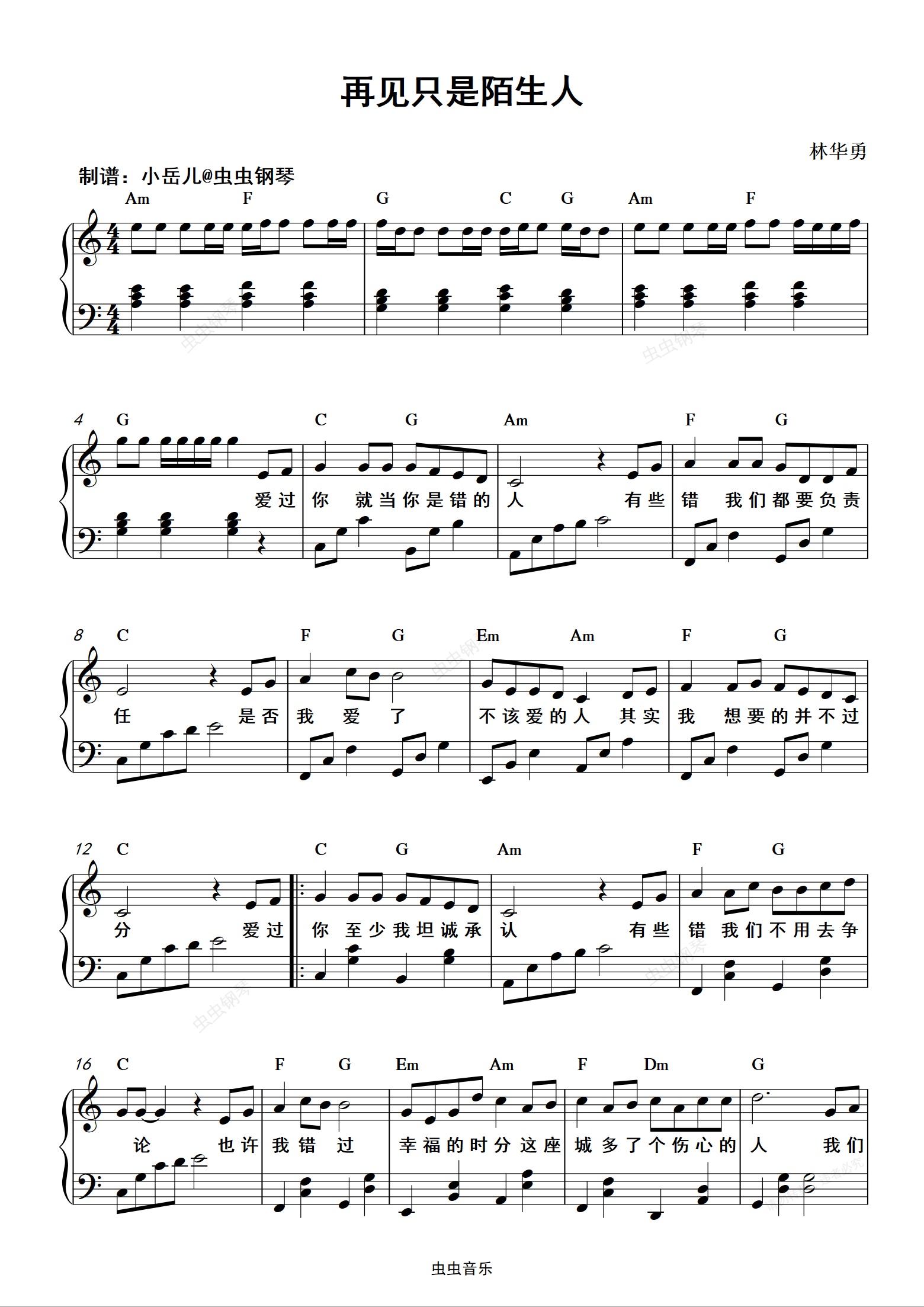 钢琴谱:再见只是陌生人 (歌词+和弦)C调简易版