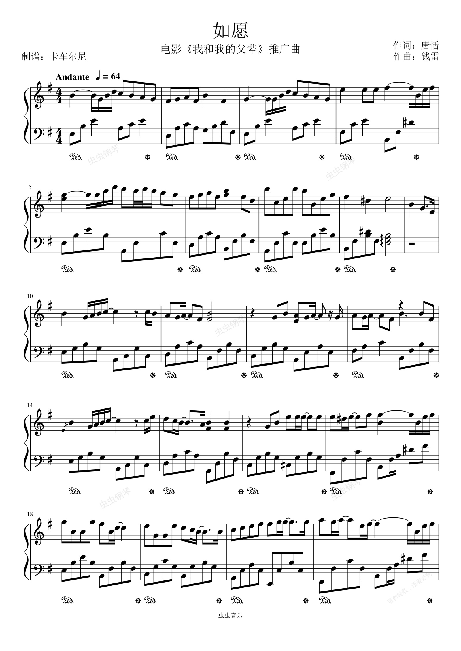 钢琴谱:《如愿》G调版,电影《我和我的父辈》推广曲