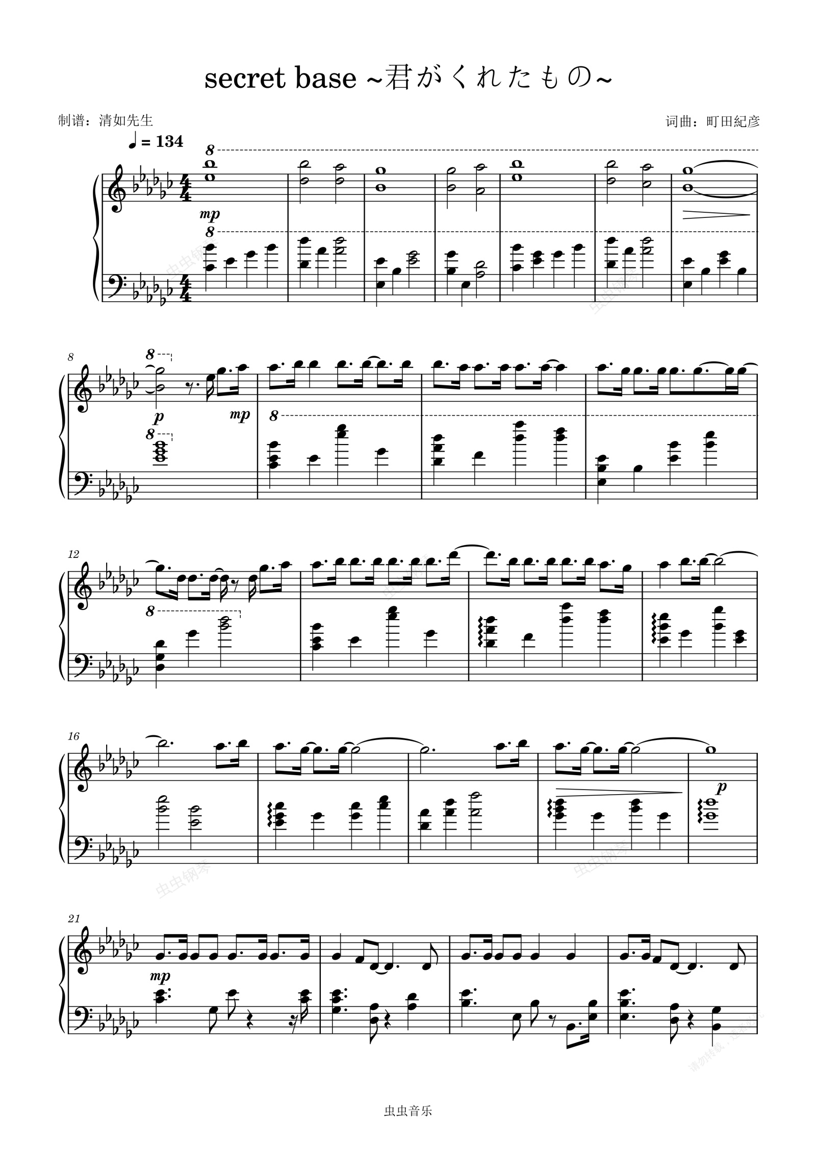 Secret base ~君がくれたもの~ ZONE 未闻花名ED 原调高燃版钢琴谱