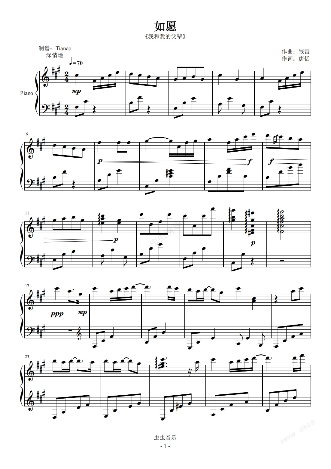 钢琴谱:《如愿》王菲,难度优化版,849难度