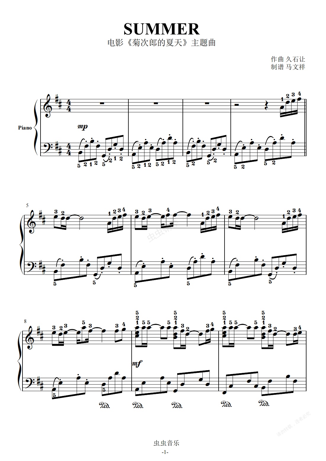 钢琴谱:菊次郎的夏天/SUMMER-小手版