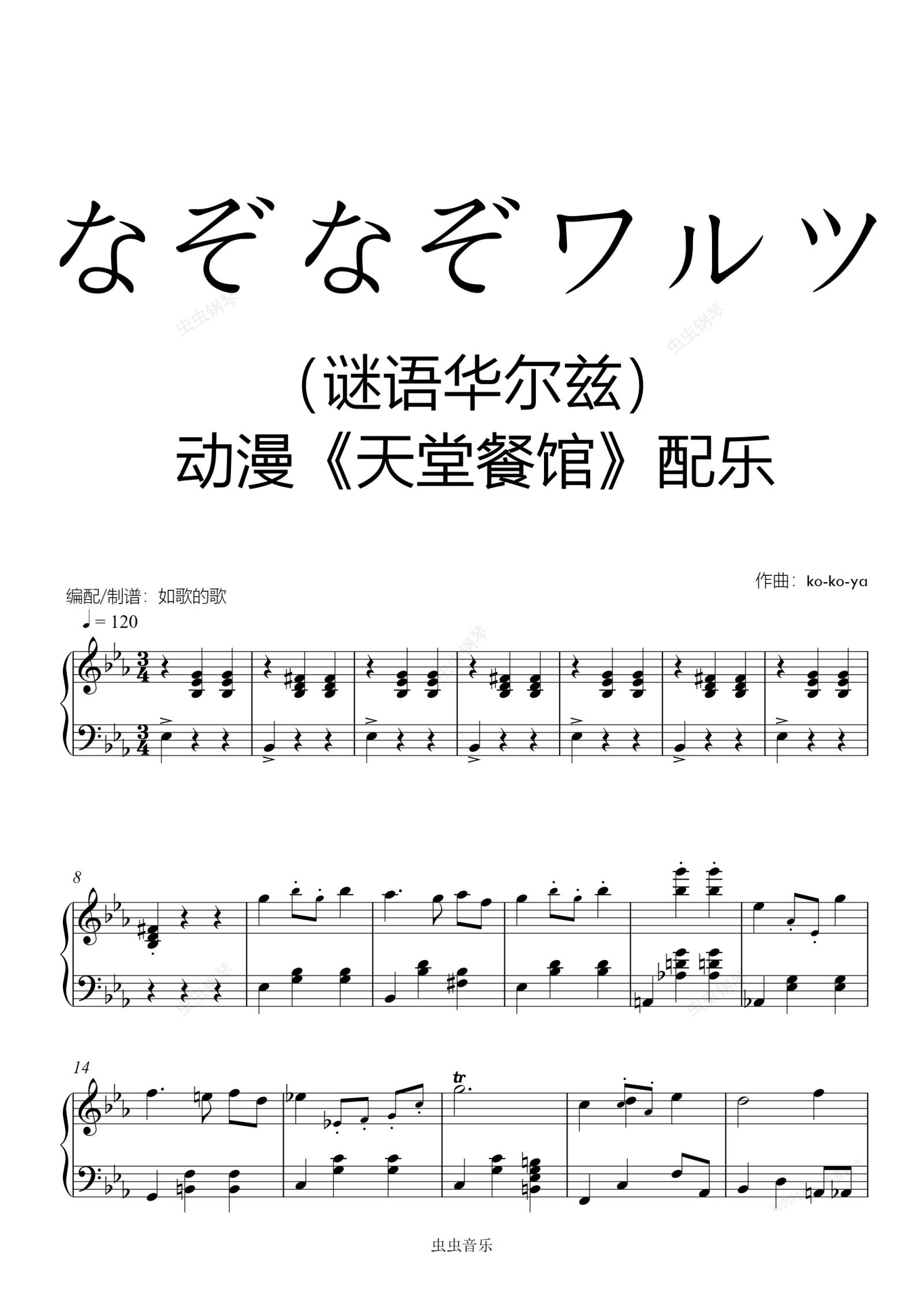 钢琴谱:なぞなぞワルツ(谜语华尔兹)《天堂餐馆》动漫配乐纯钢琴