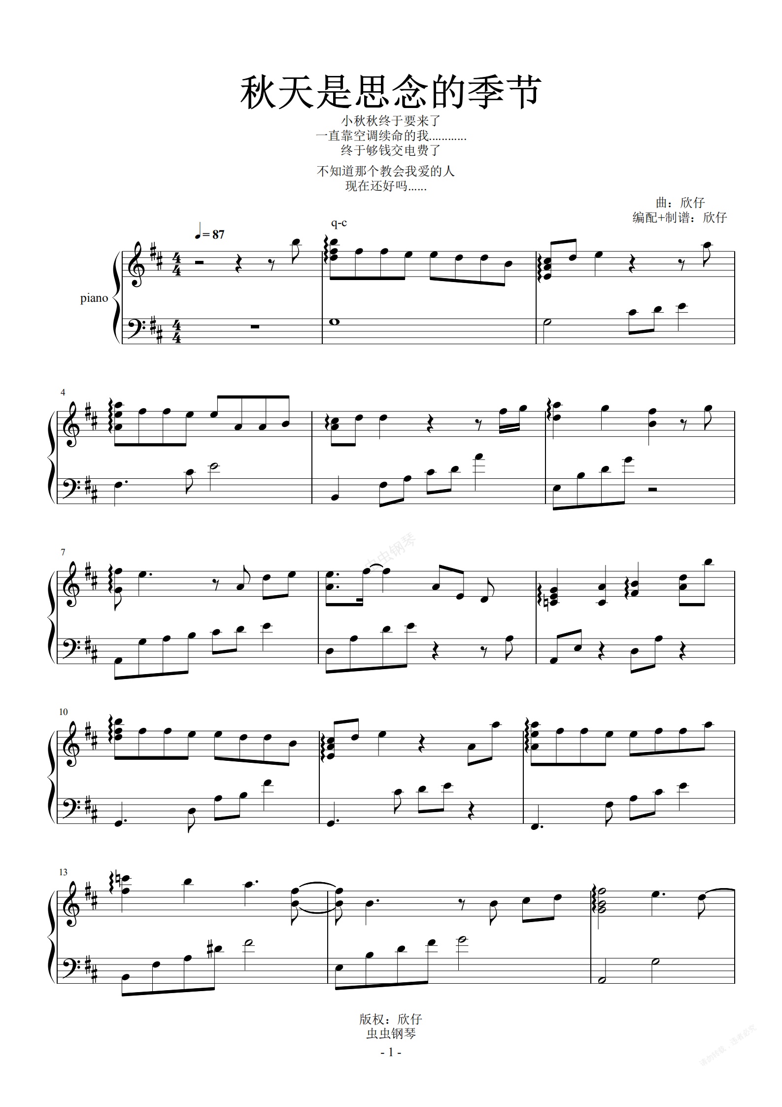 钢琴谱:欣仔-D《秋天是思念的季节》