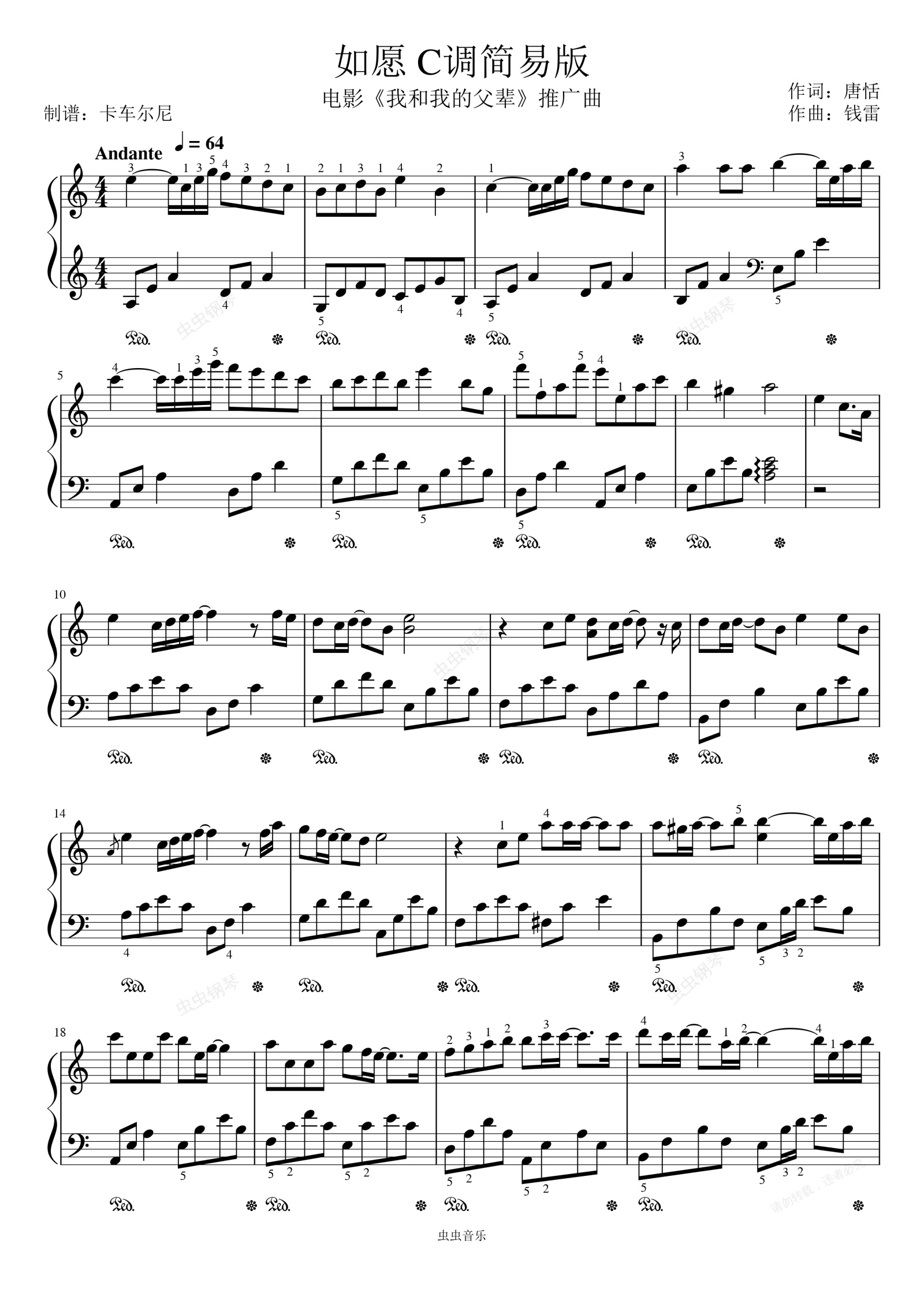 钢琴谱:如愿 C调简易教学版 带指法 电影《我和我的父辈》推广曲