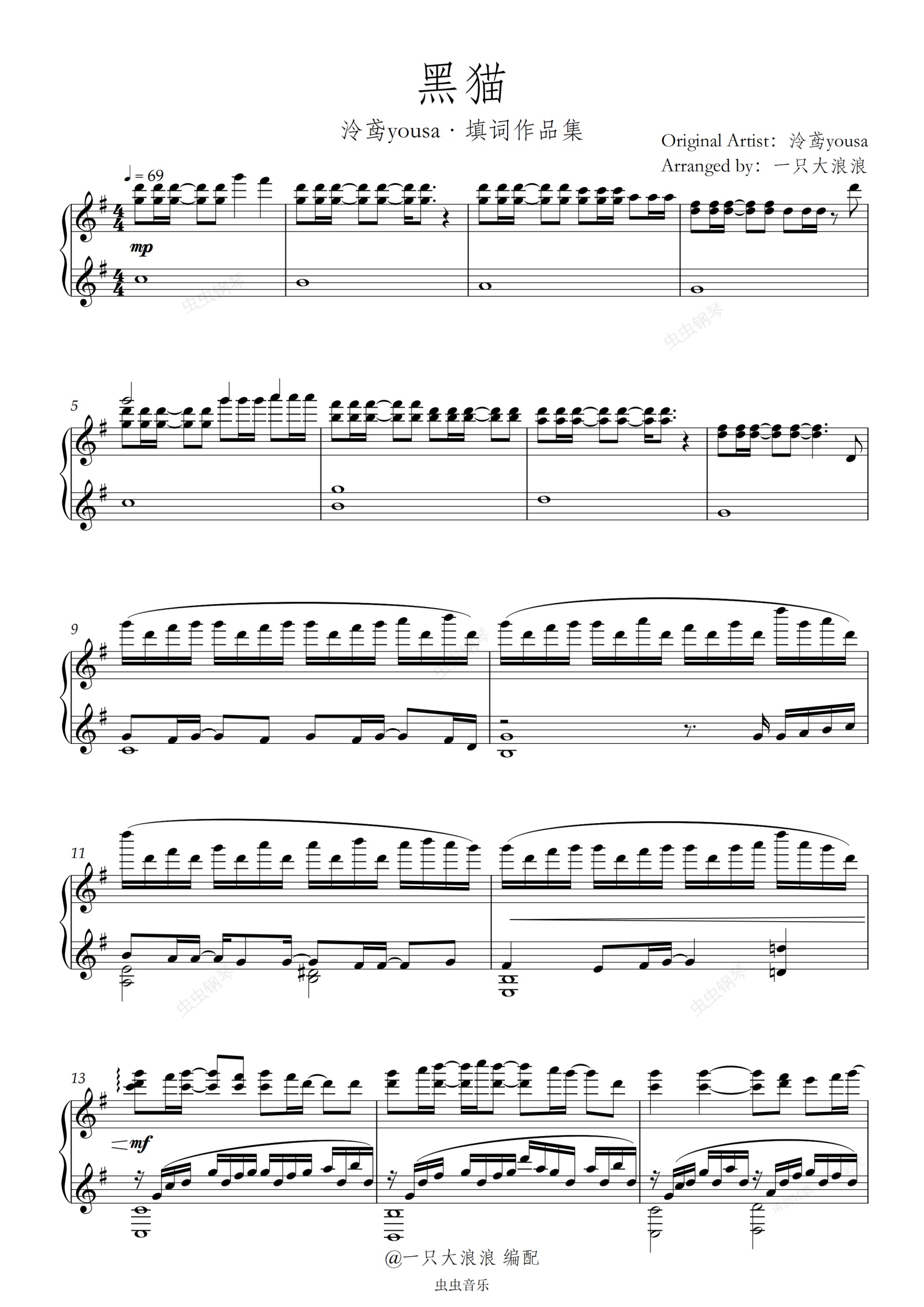 钢琴谱:黑猫 抒情钢琴版(泠鸢yousa)