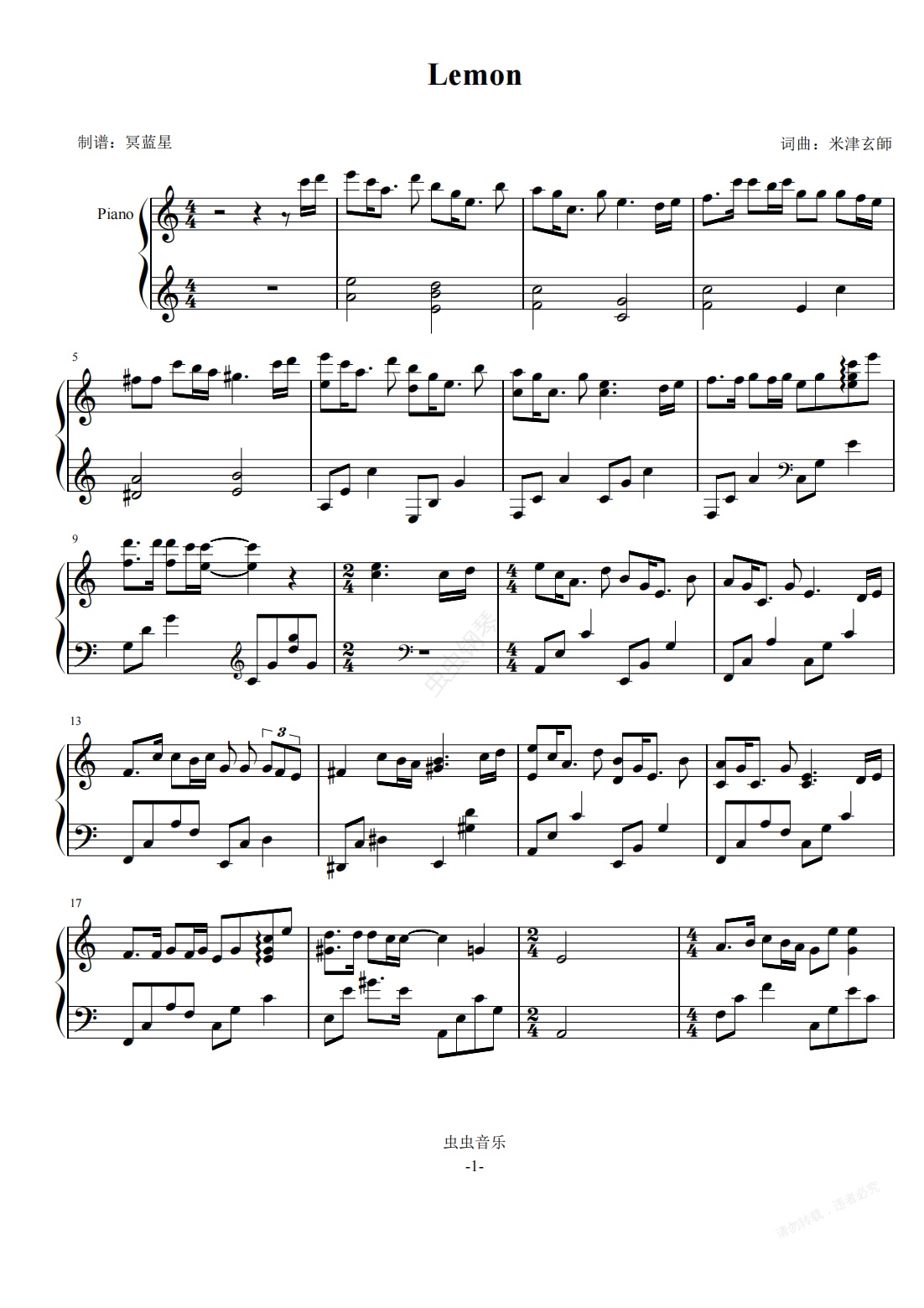 钢琴谱:米津玄师-Lemon-C调演奏谱